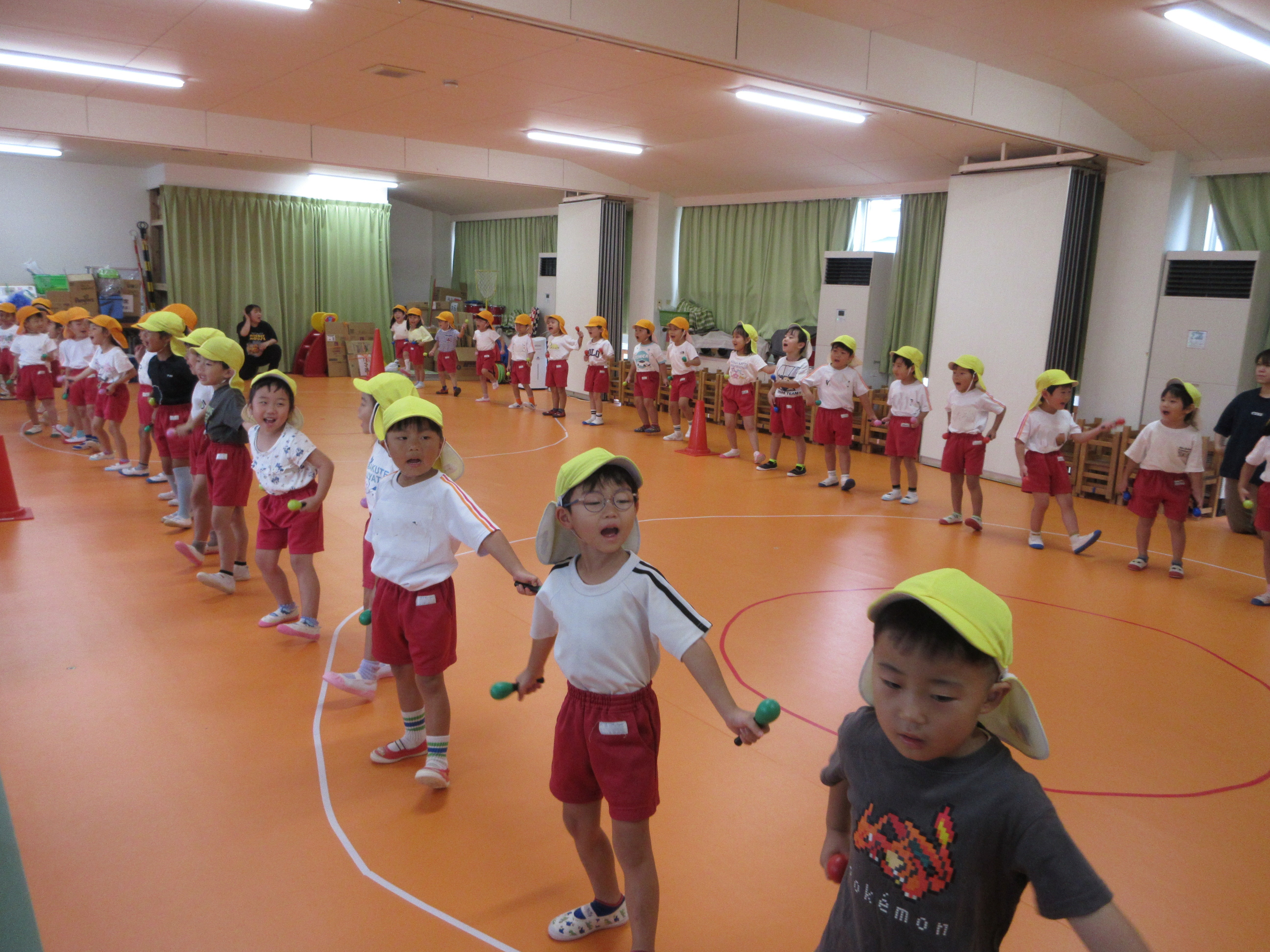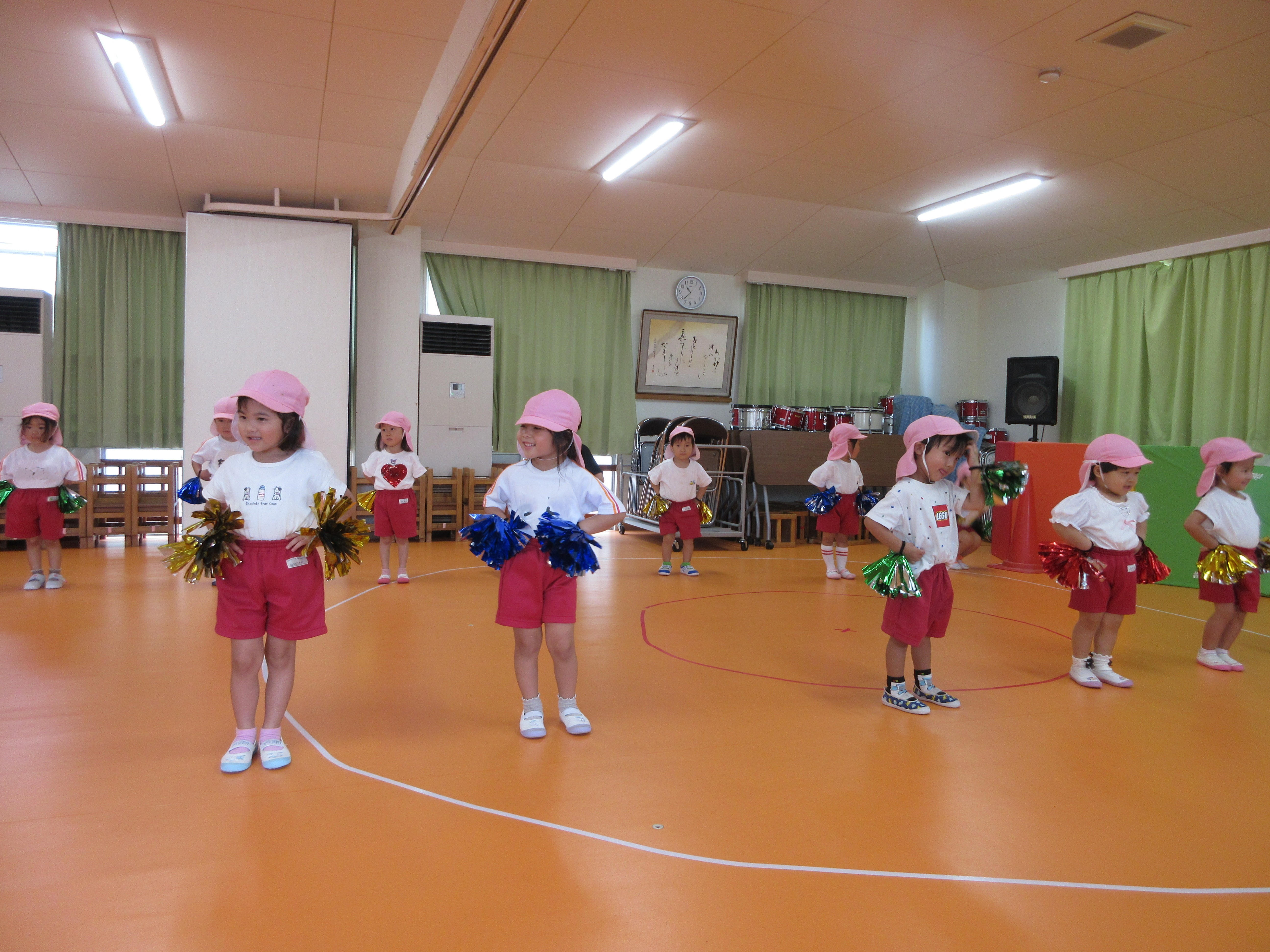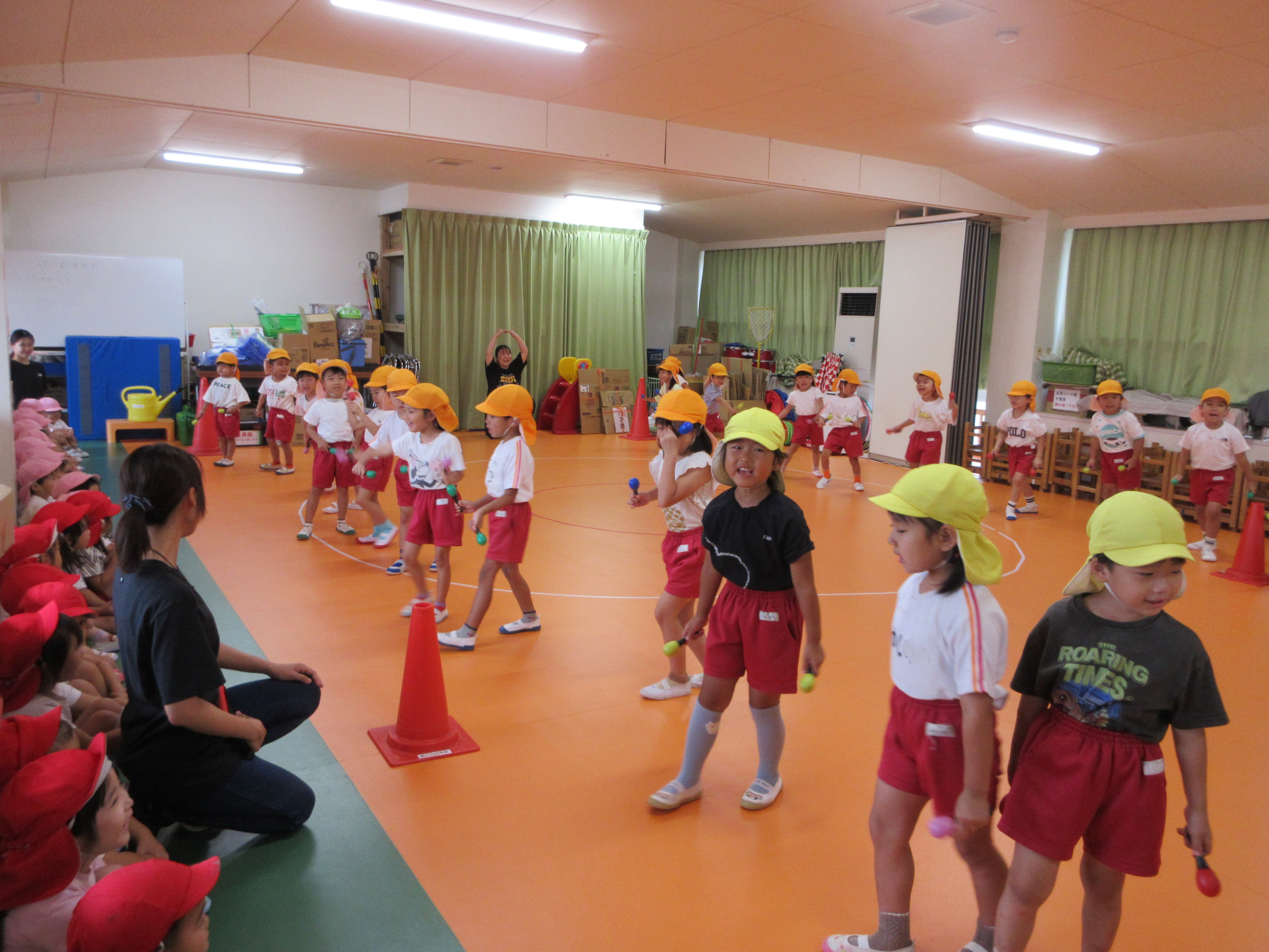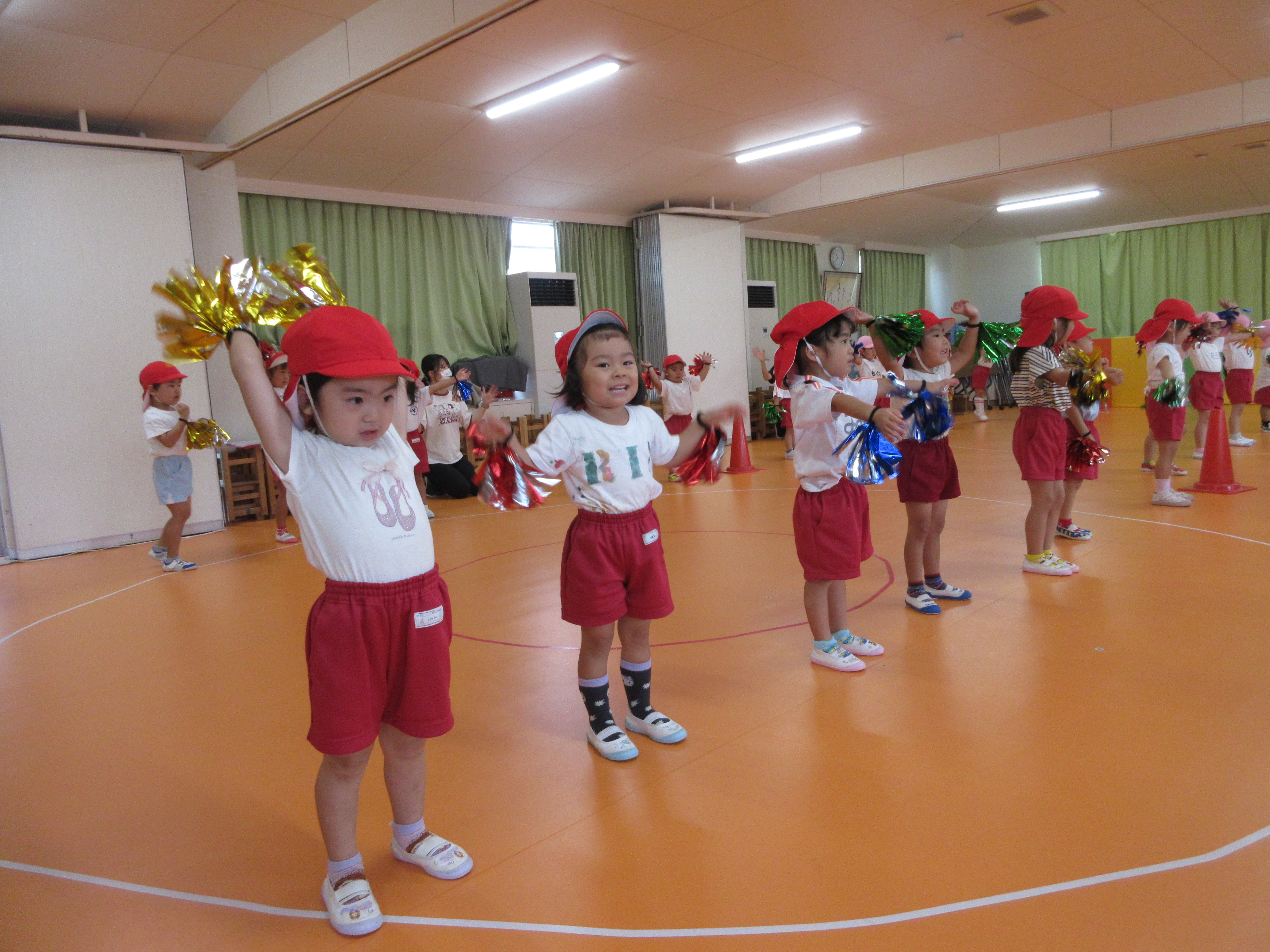 運動会で踊るダンスを、年少と年中がお互い見せ合いっこをしました。年少は「キミに100パーセント」、年中は「恐竜サンバ」です。それぞれ頑張って踊る姿に拍手でたたえ合い、元気と自信をもらいました。