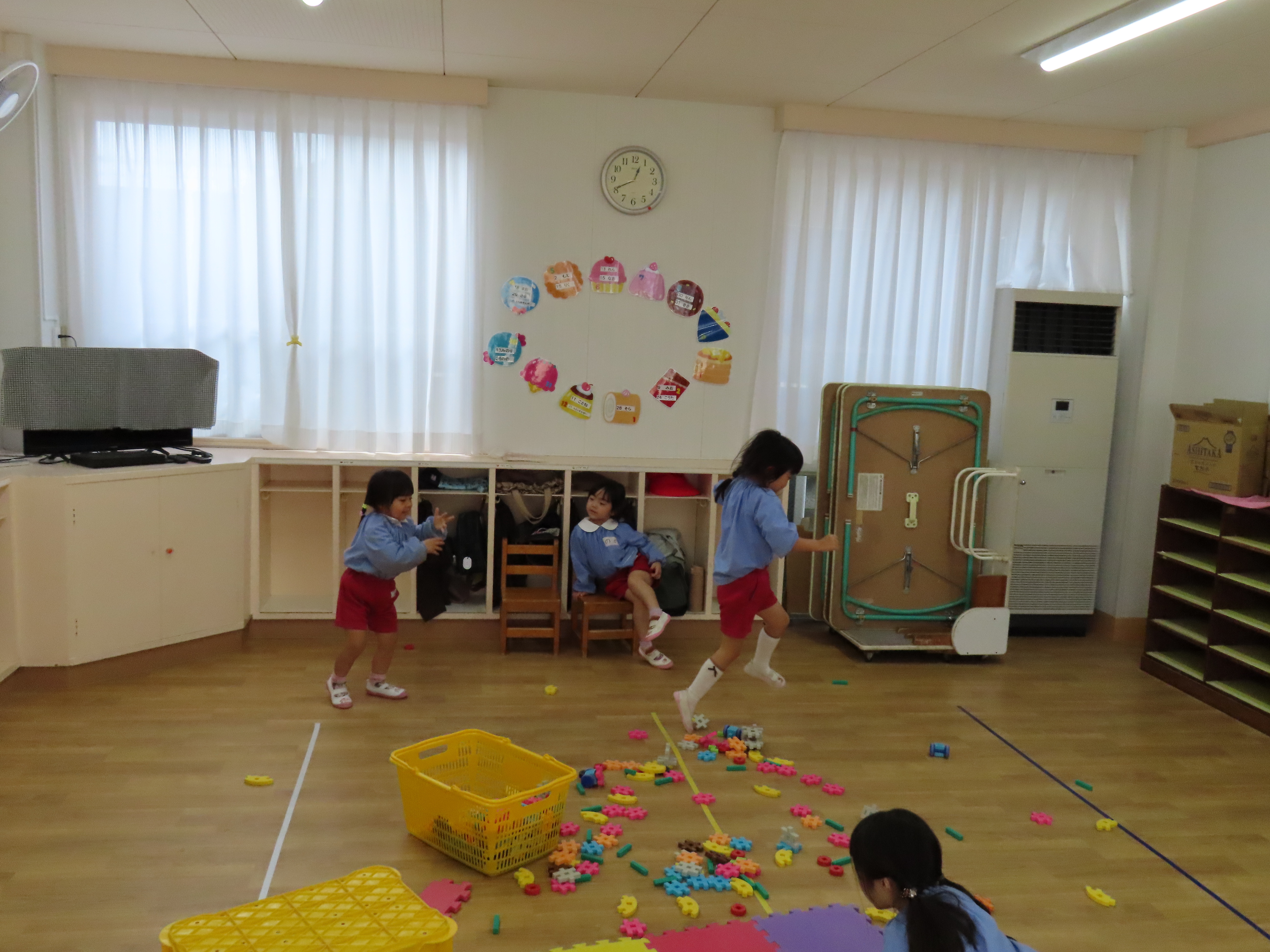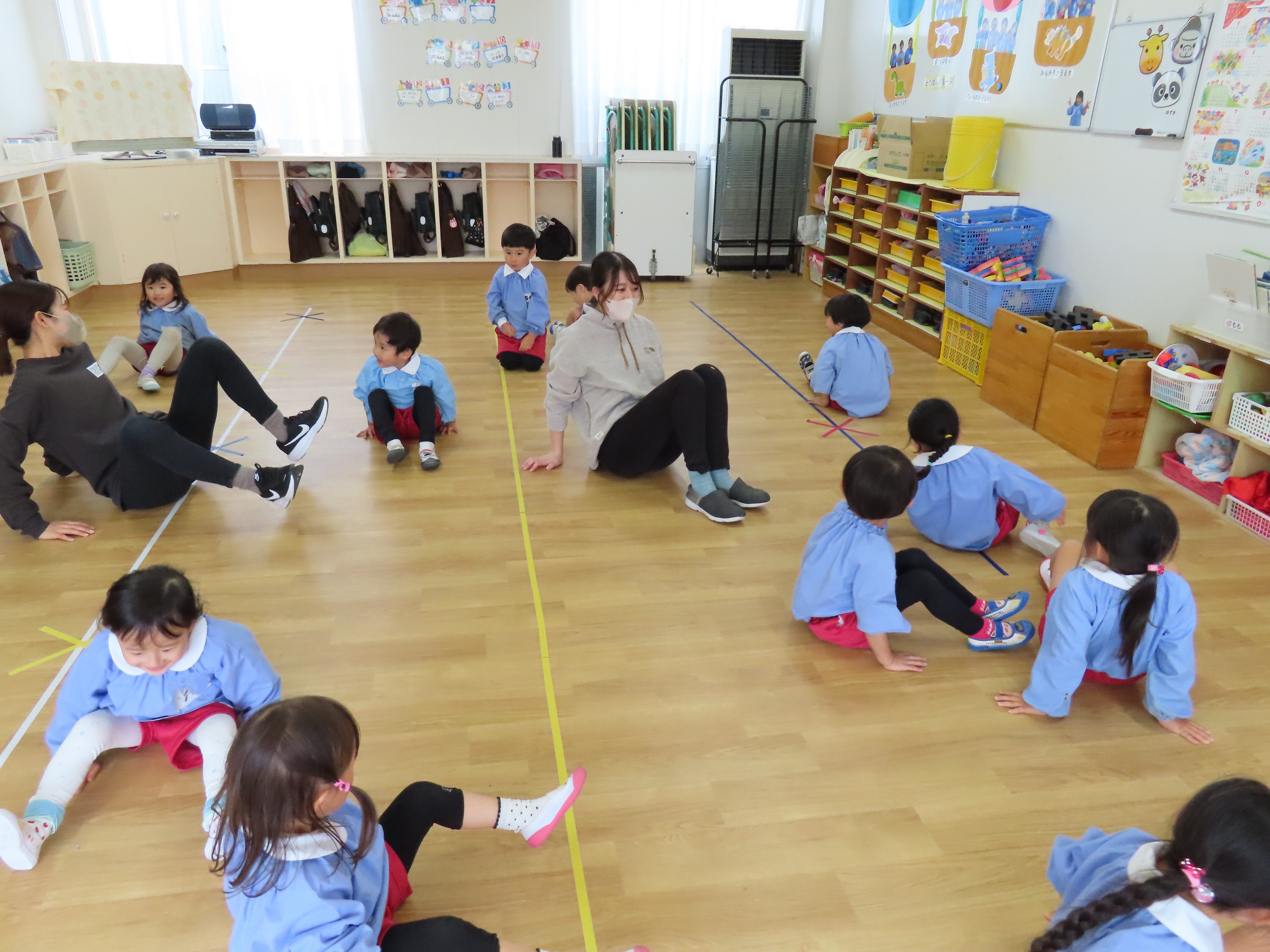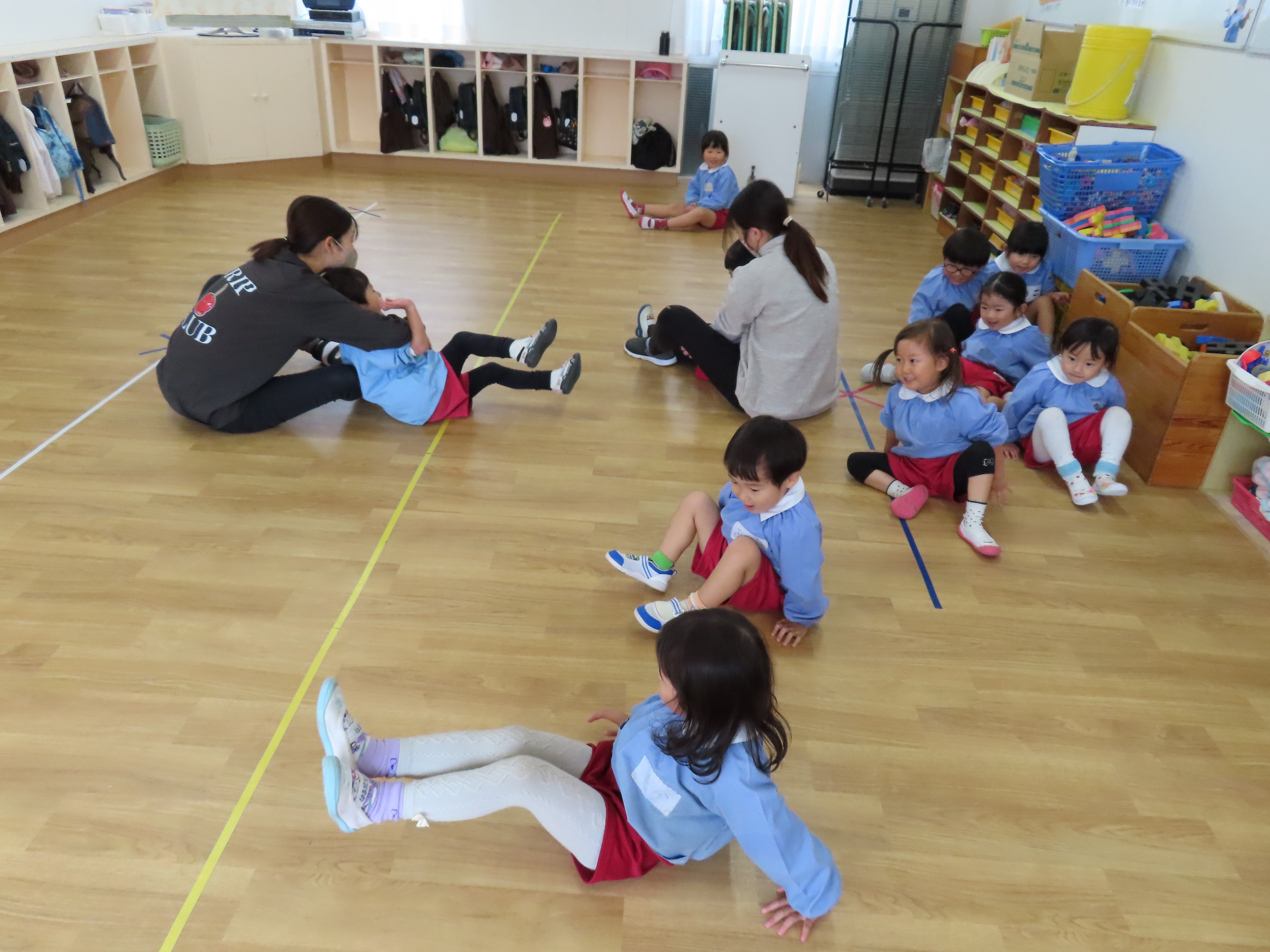年少では先生に好きな音楽をかけてもらってダンスをしたり、お尻をつけたまま移動しながらの鬼ごっこをしていました。