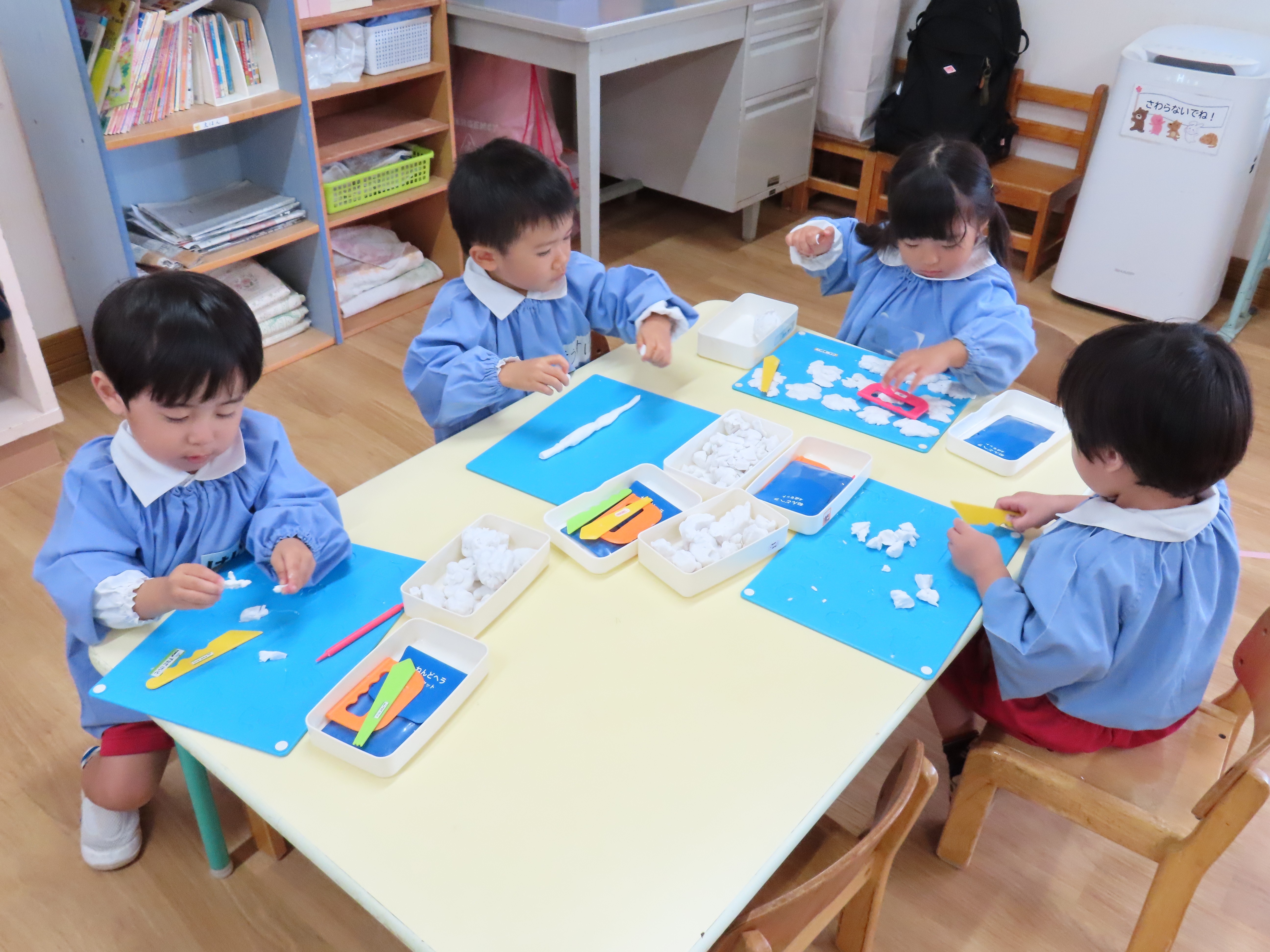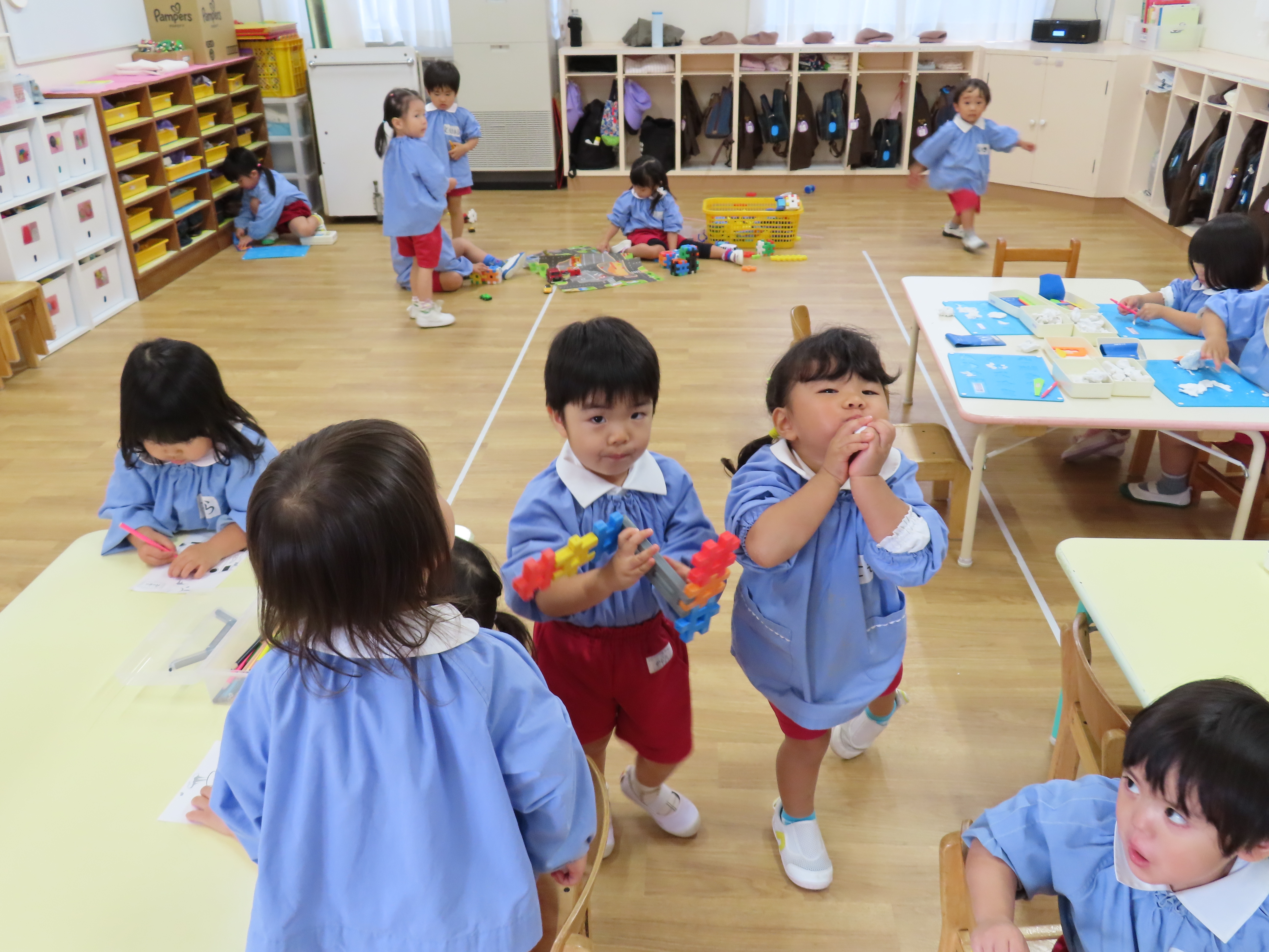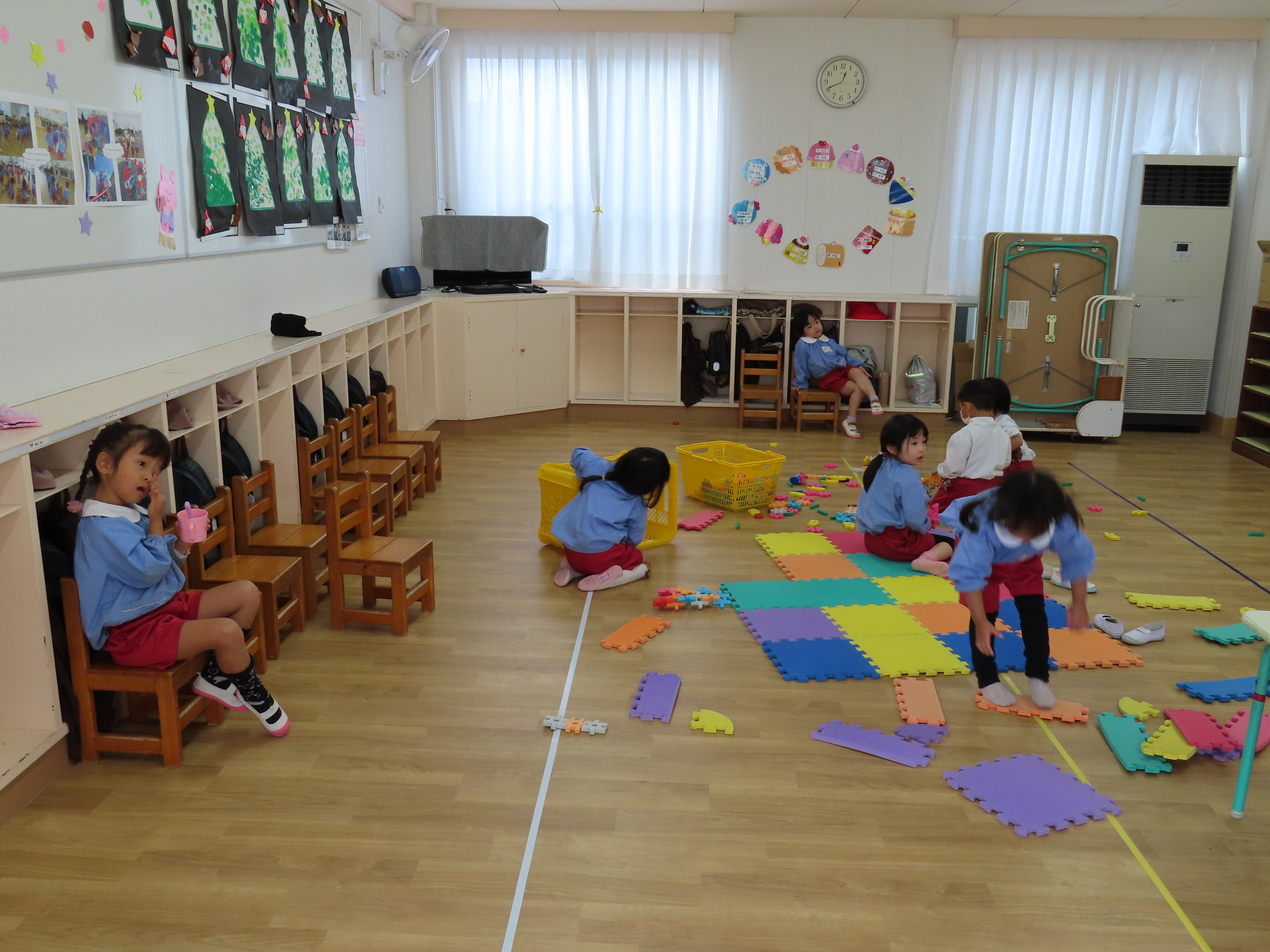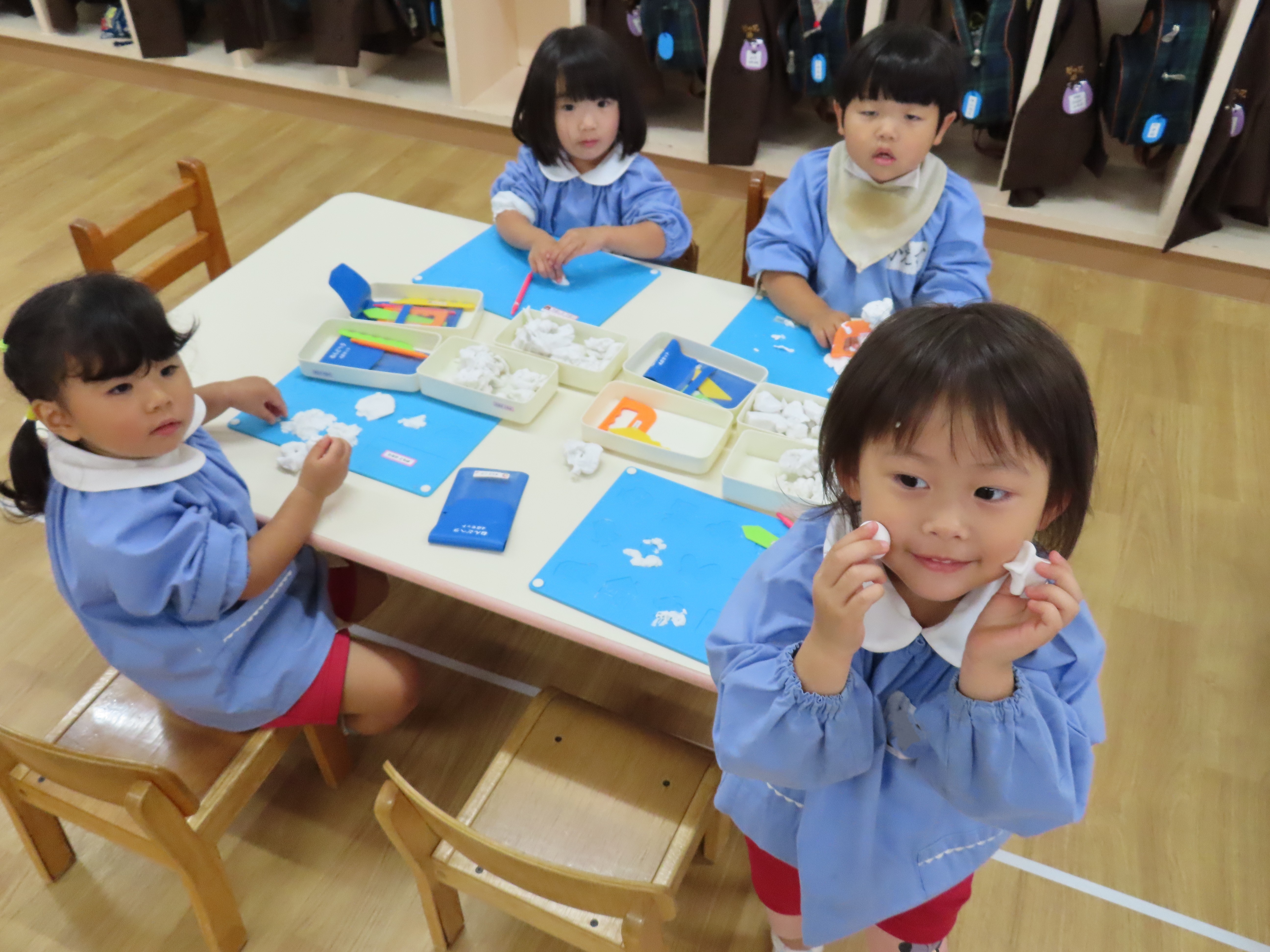 給食後、年少々は粘土遊びやぬり絵、パズル等で遊んでいました。