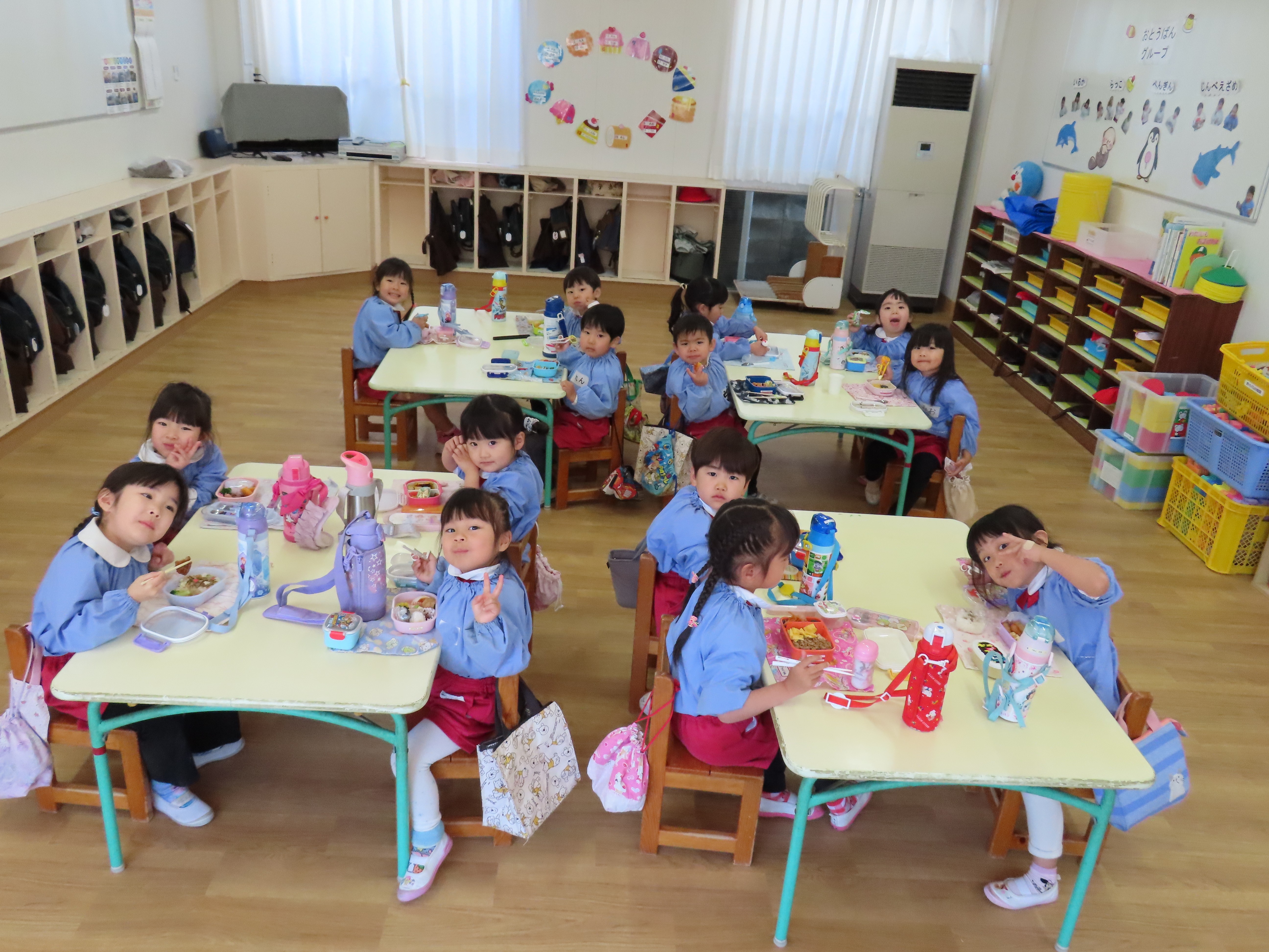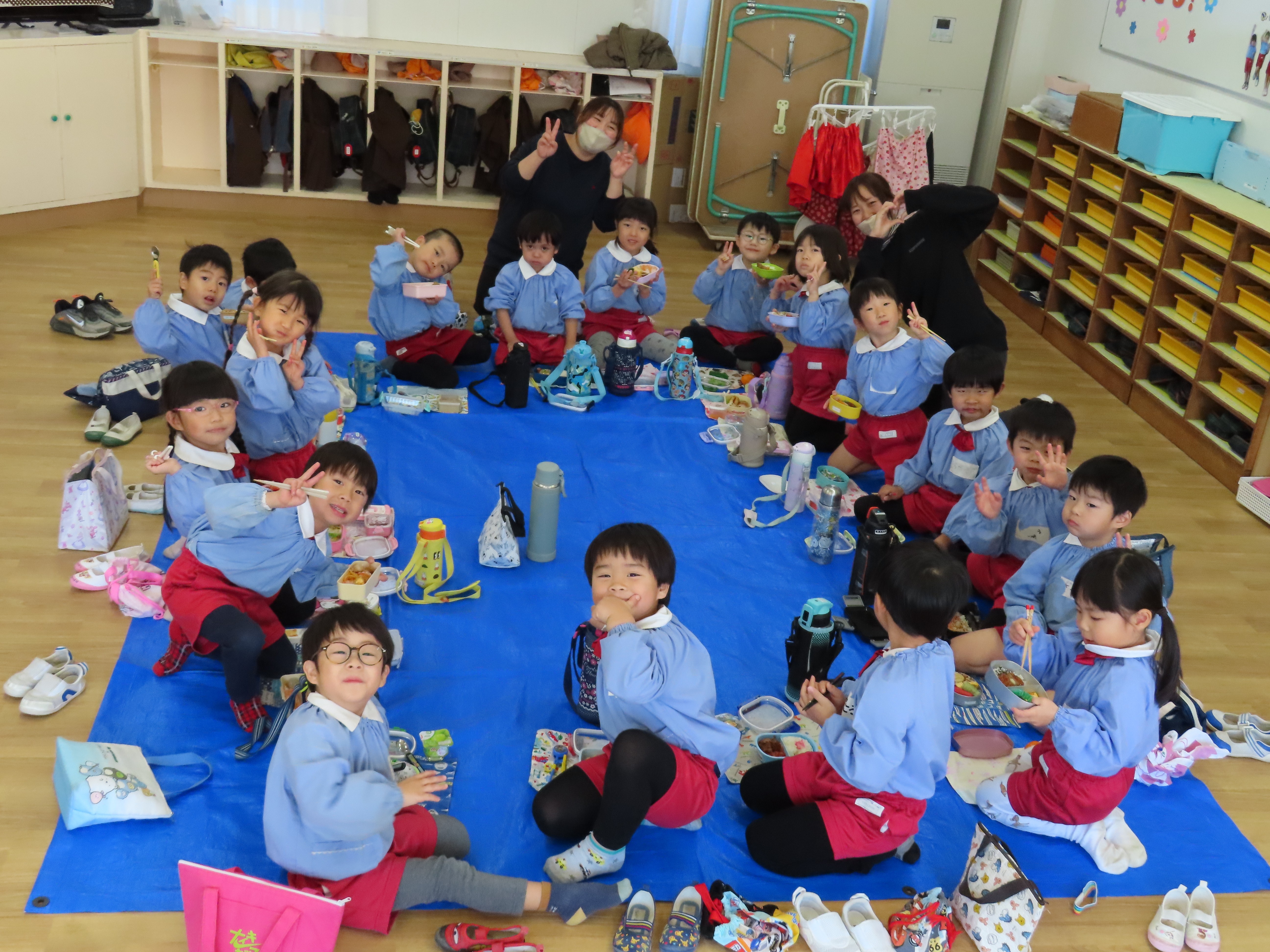 3学期初日は、主に体を使う遊びなどをして、子ども達の体と心をほぐしました。久しぶりに登園している園児もいて、少し緊張している様子もあります。遊びを通して、柔らかい心になって行きます。また、木曜日はお弁当の日なので、ピクニックのようにして食べているクラスもありました。