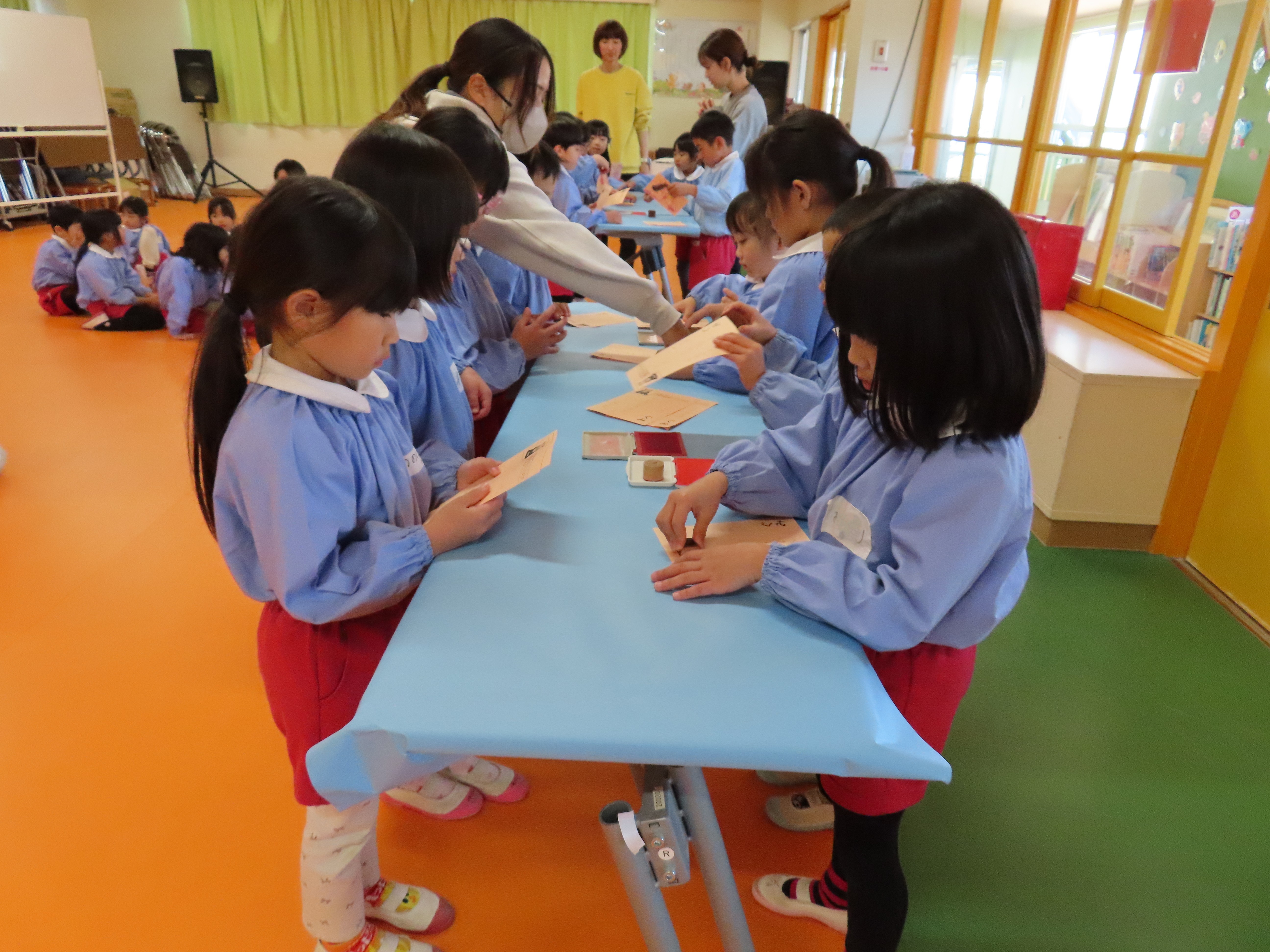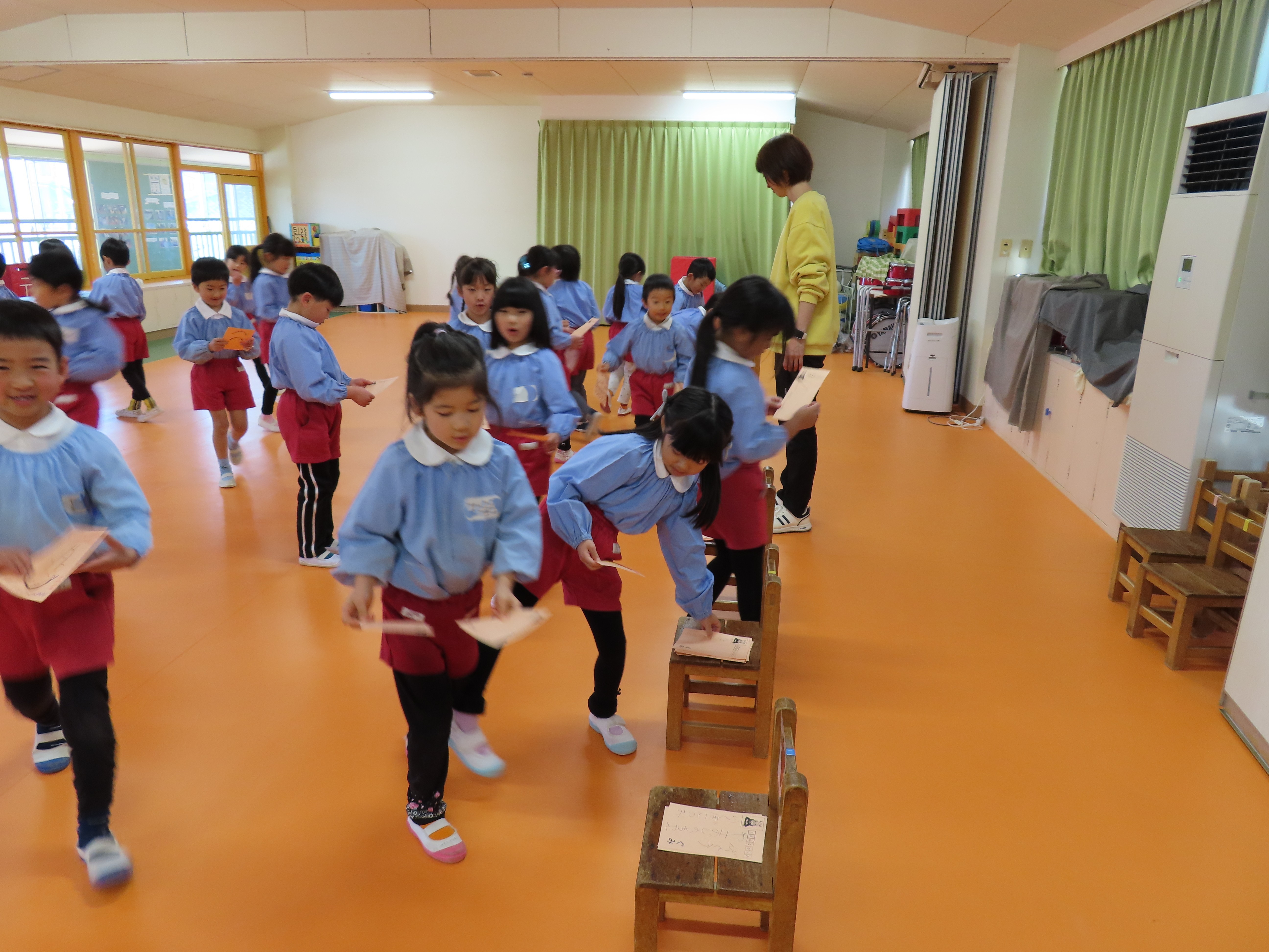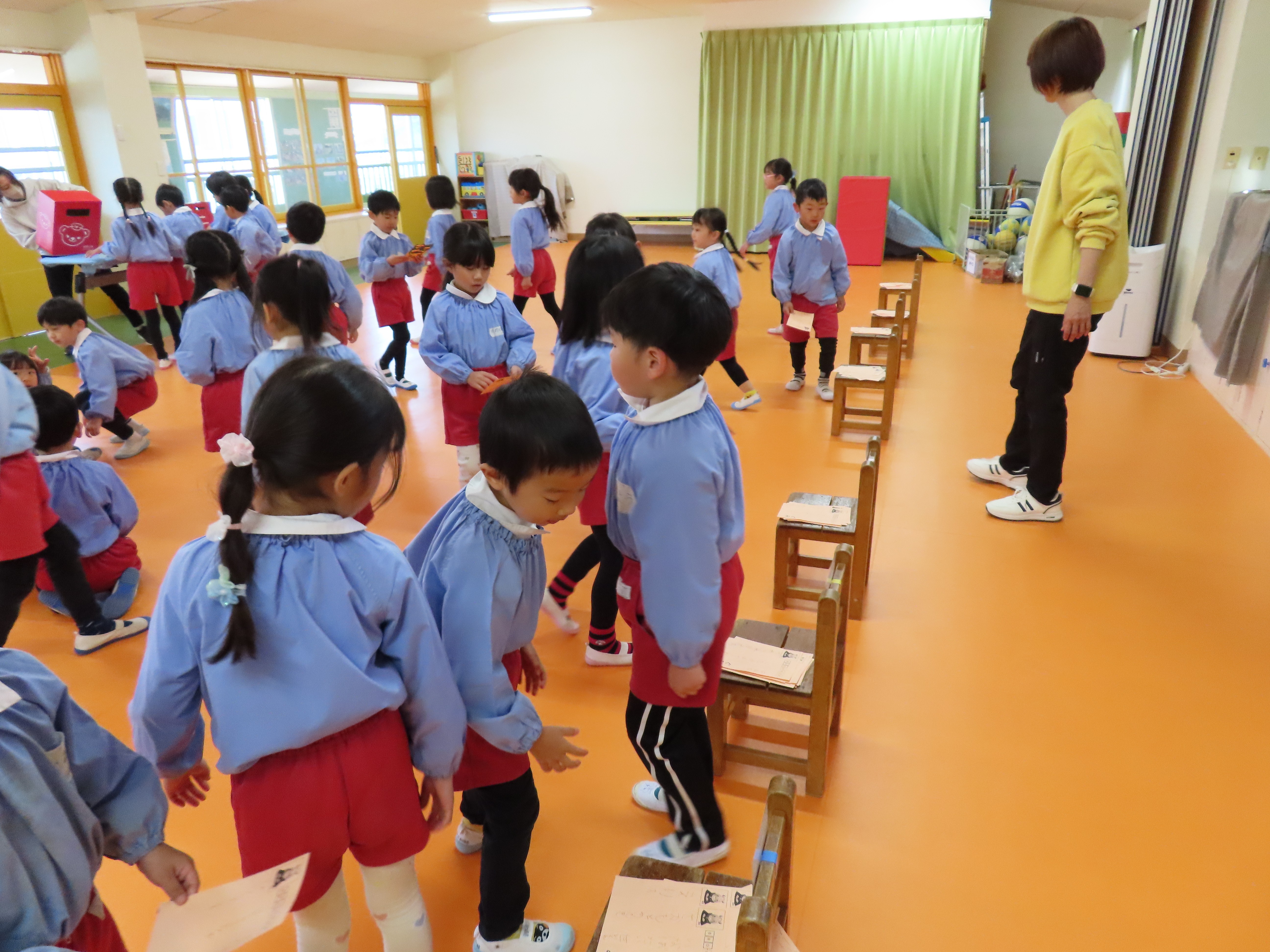 ポストに入れられたハガキは、年長さんが回収し、リズム室にできた「ののはなゆうびんきょく」に集められます。「ゆうびんきょく」では、まずクラスごとに仕分けがあります。クラス名が書かれた椅子に分けて行きます。