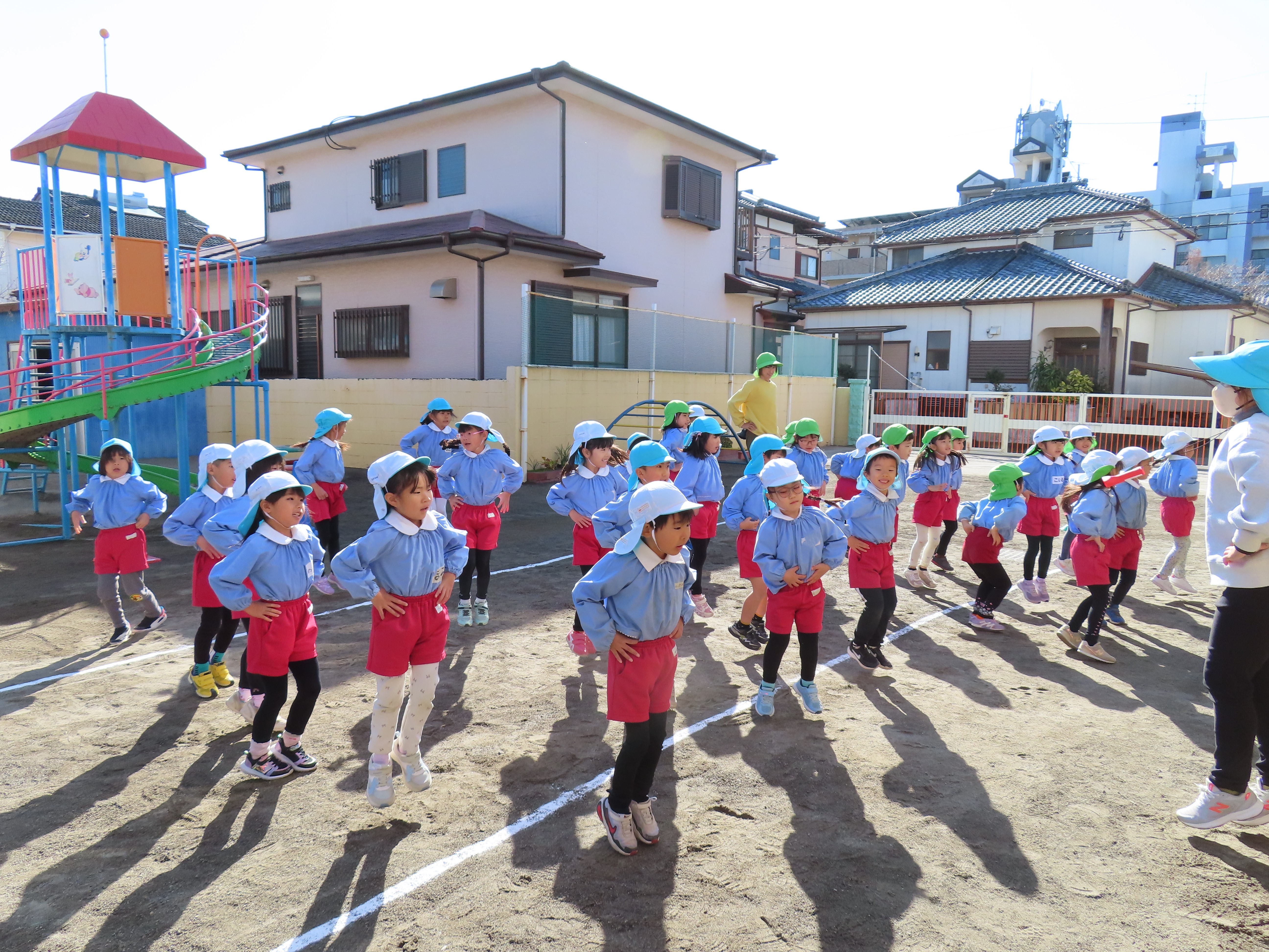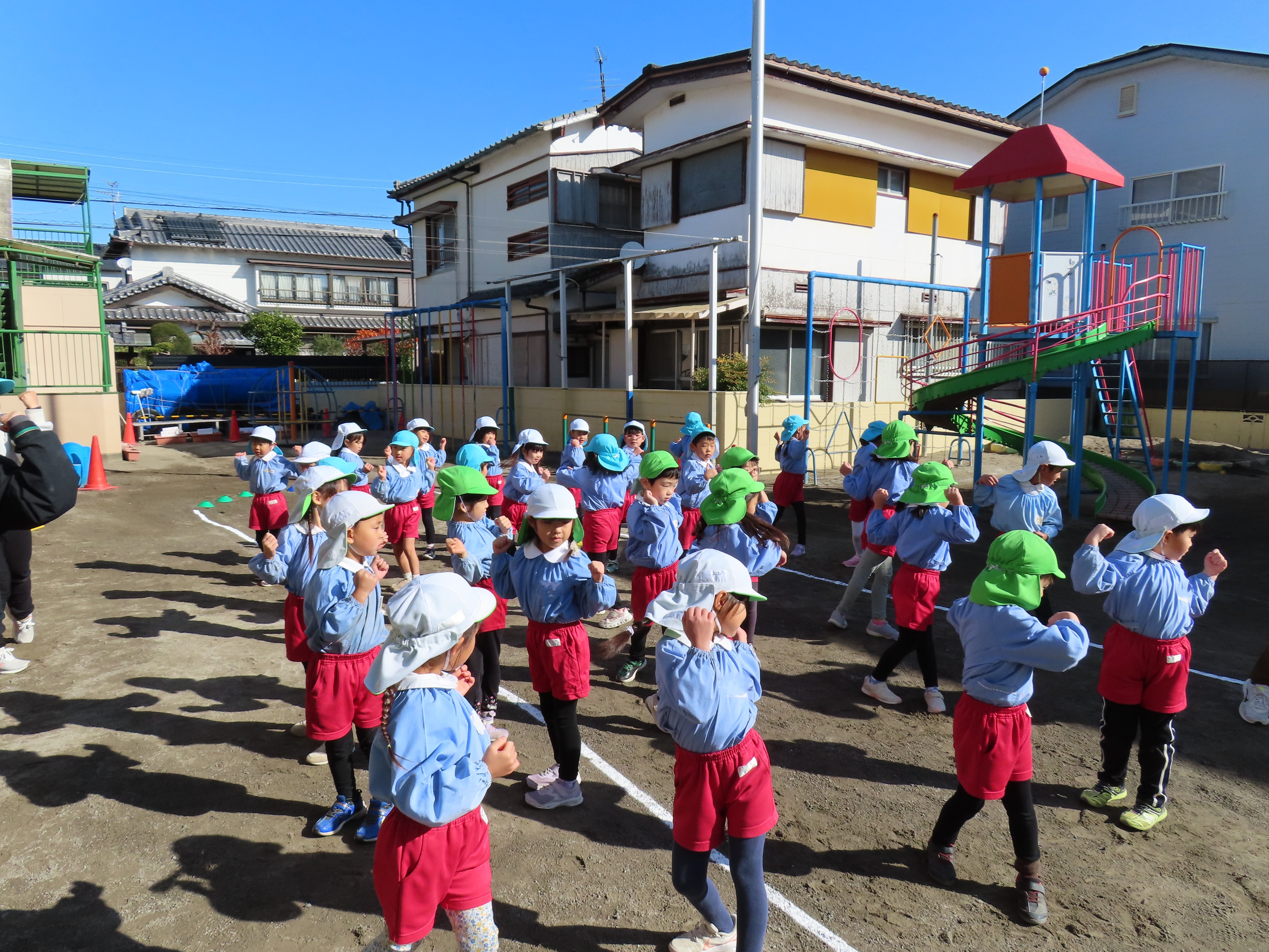 年少々のすみれ組が園庭でマラソン大会の練習をしました。最初はウオーミングアップの「おはようたいそう」です。体を少し温めます。今日は園庭を5周しました。練習始めの頃は、ラインを無視してショートカットしたりする園児もいましたが、何度か走る内にルールも理解して来ました。しっかり走った後は、滑り台を1回滑って教室に戻りました。