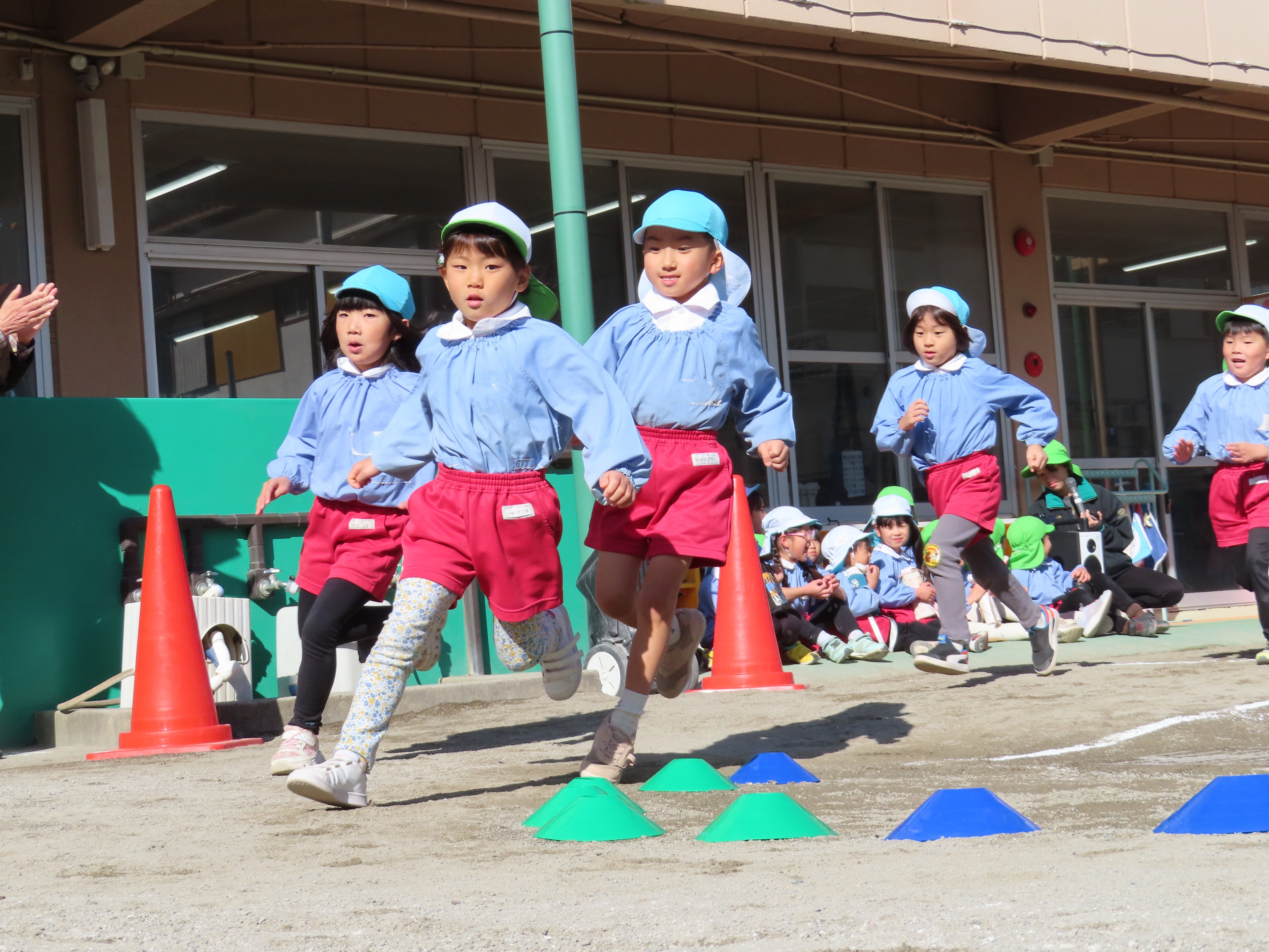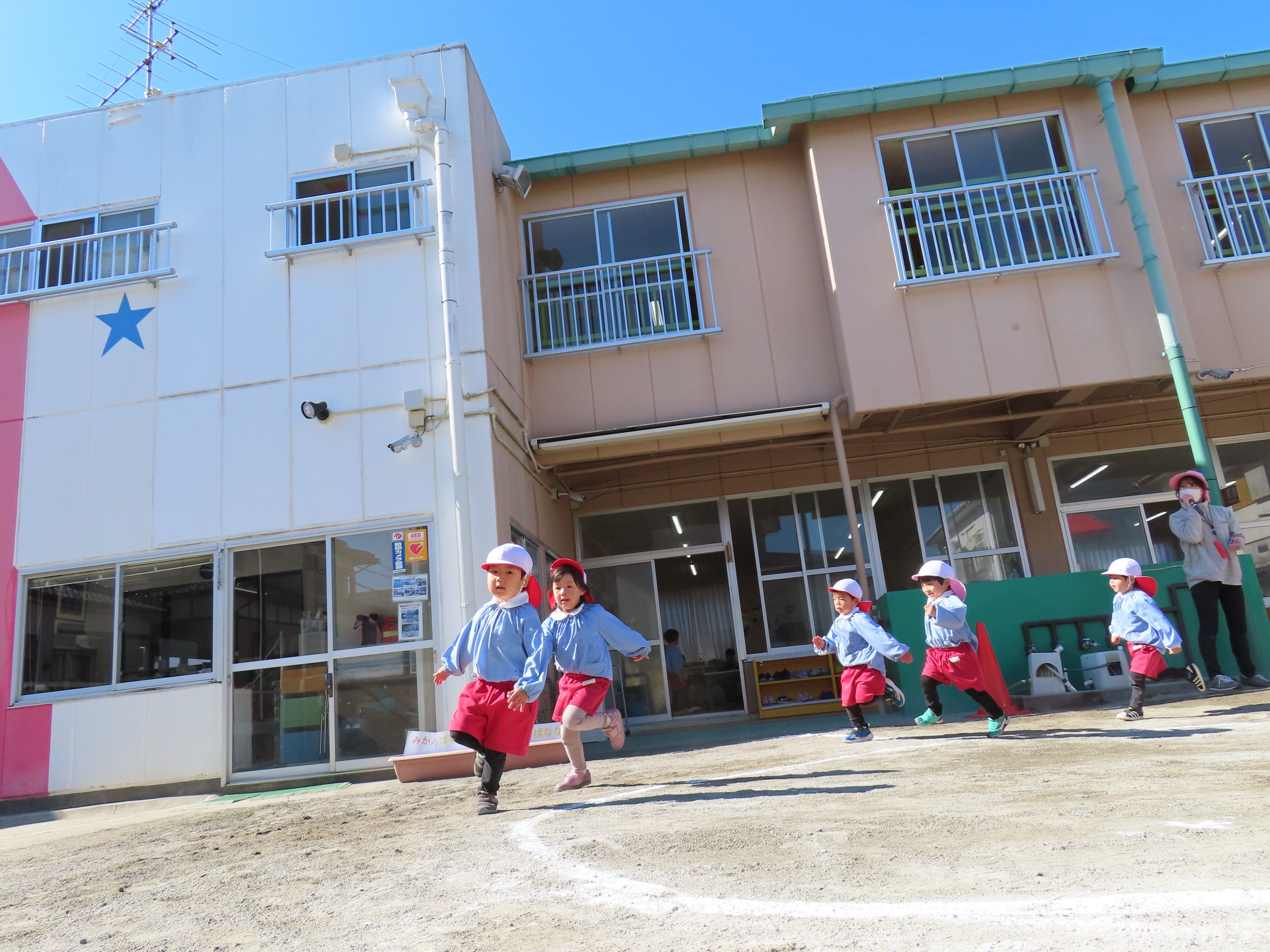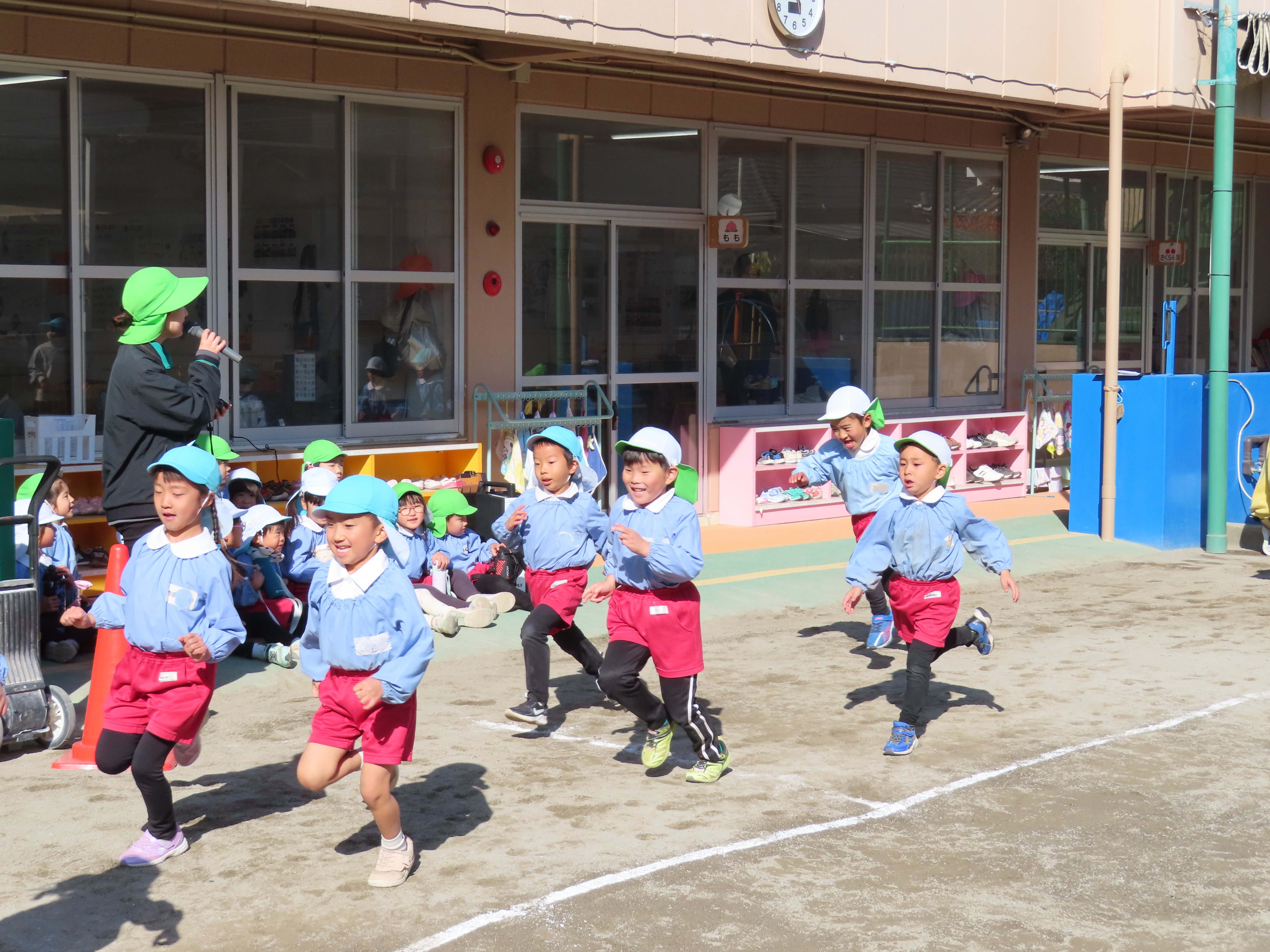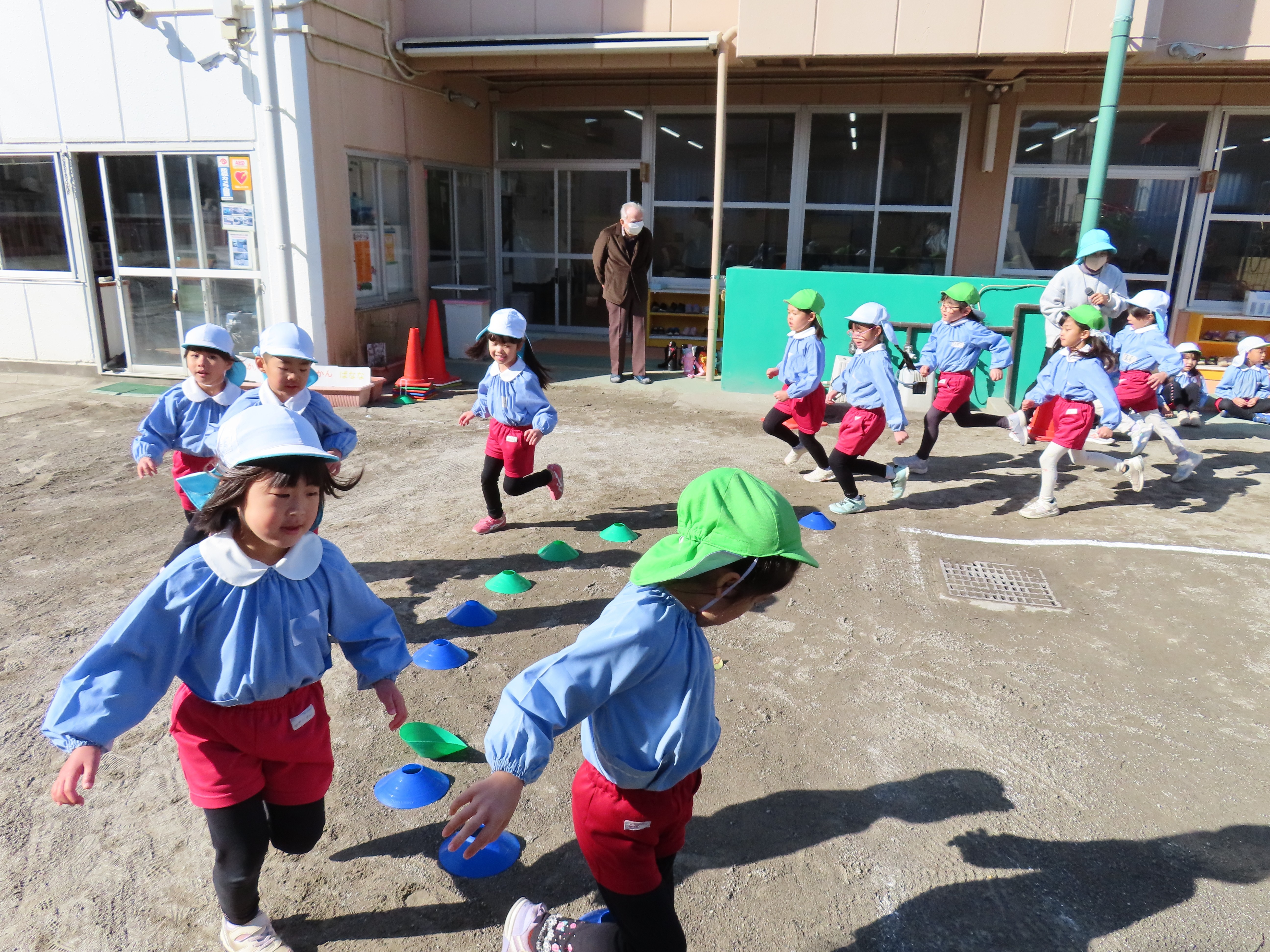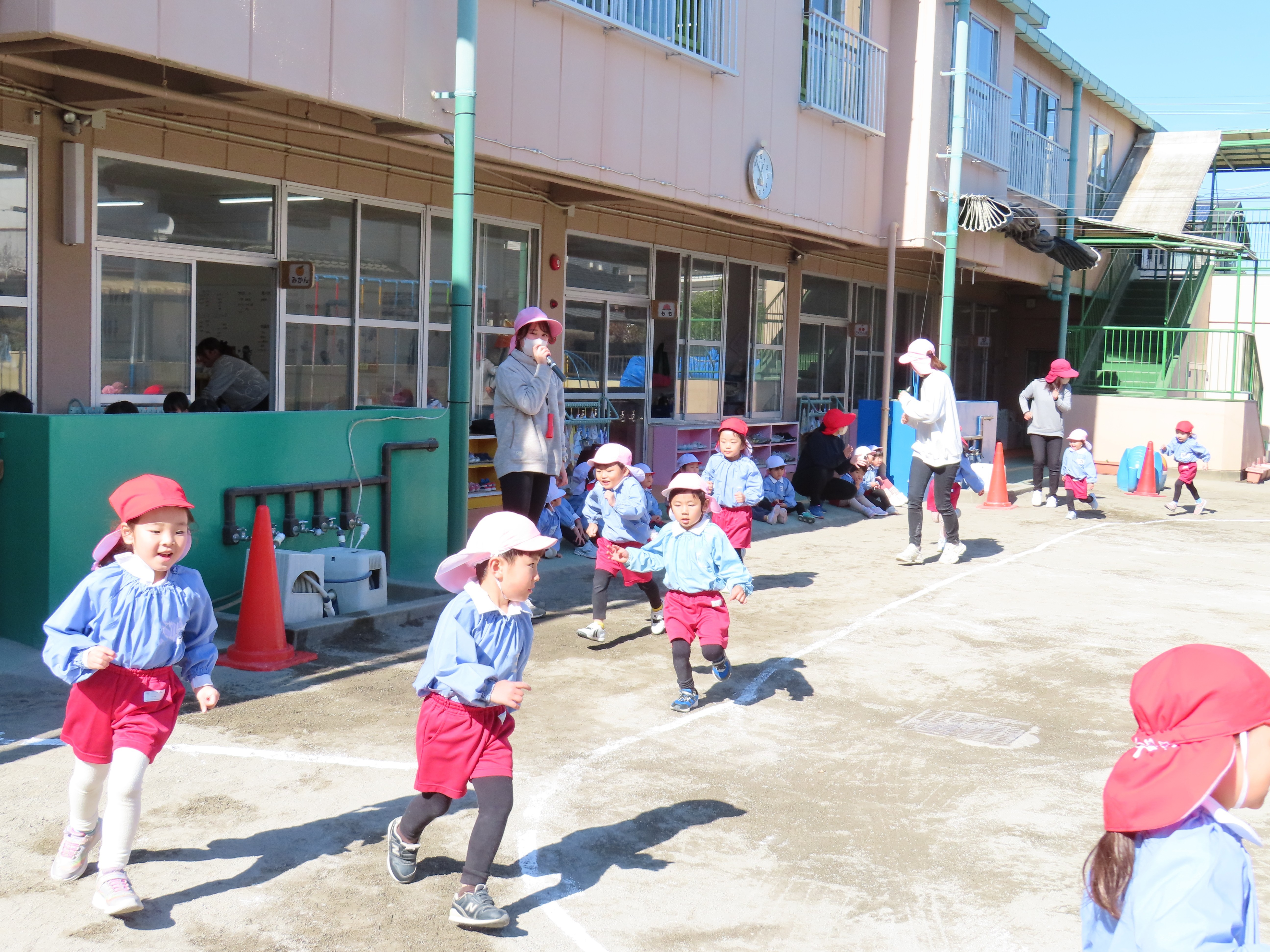 年長さんが園庭でマラソン大会の練習をしました。まず、開会の挨拶担当の園児の練習をしました。皆の前でドキドキしている様子でした。その後は準備体操です。マラソンは自分のペースで5分間走ります。ちょっと寒い一日でしたが、しっかり走って身体が温まったようでした。