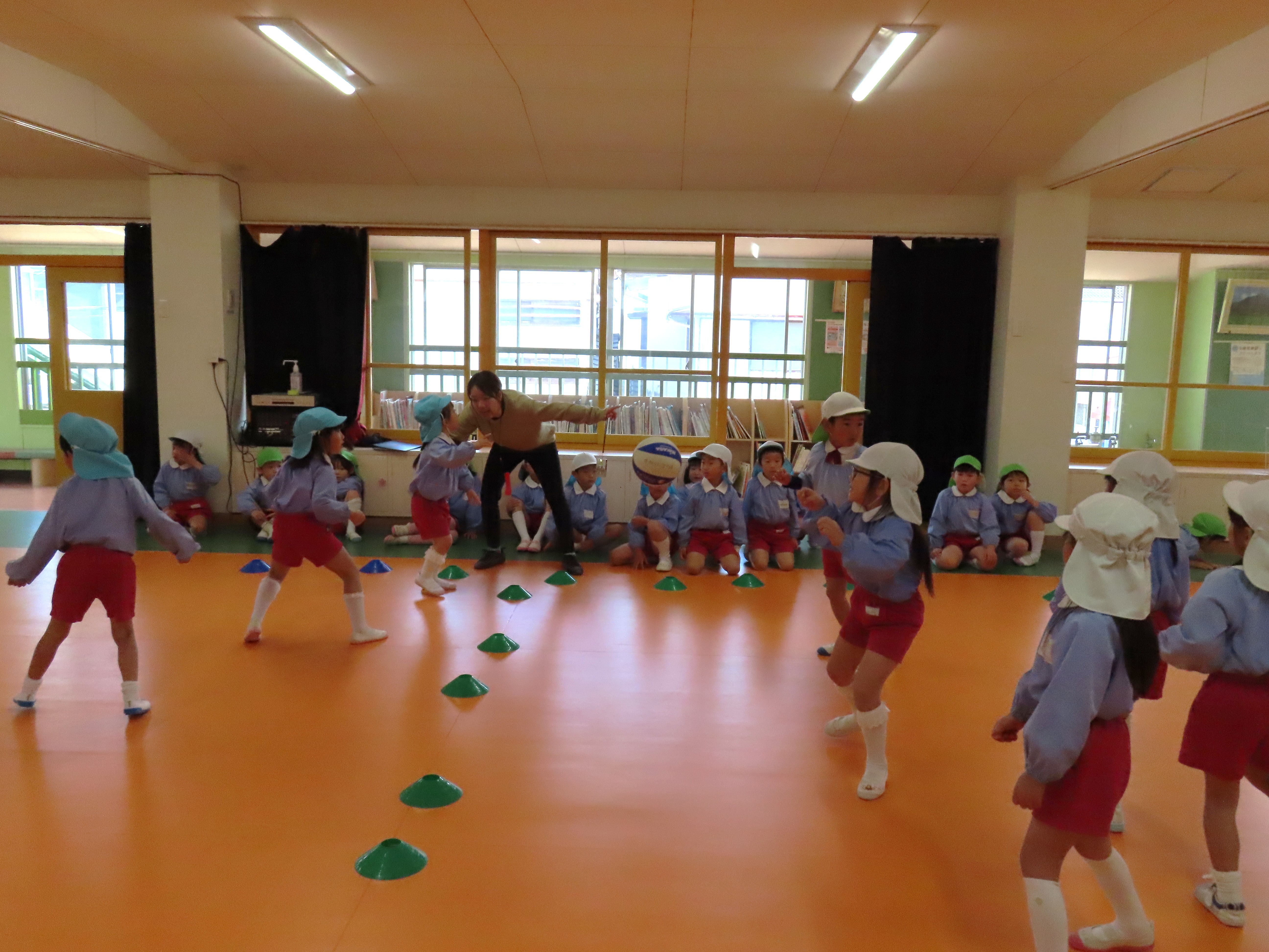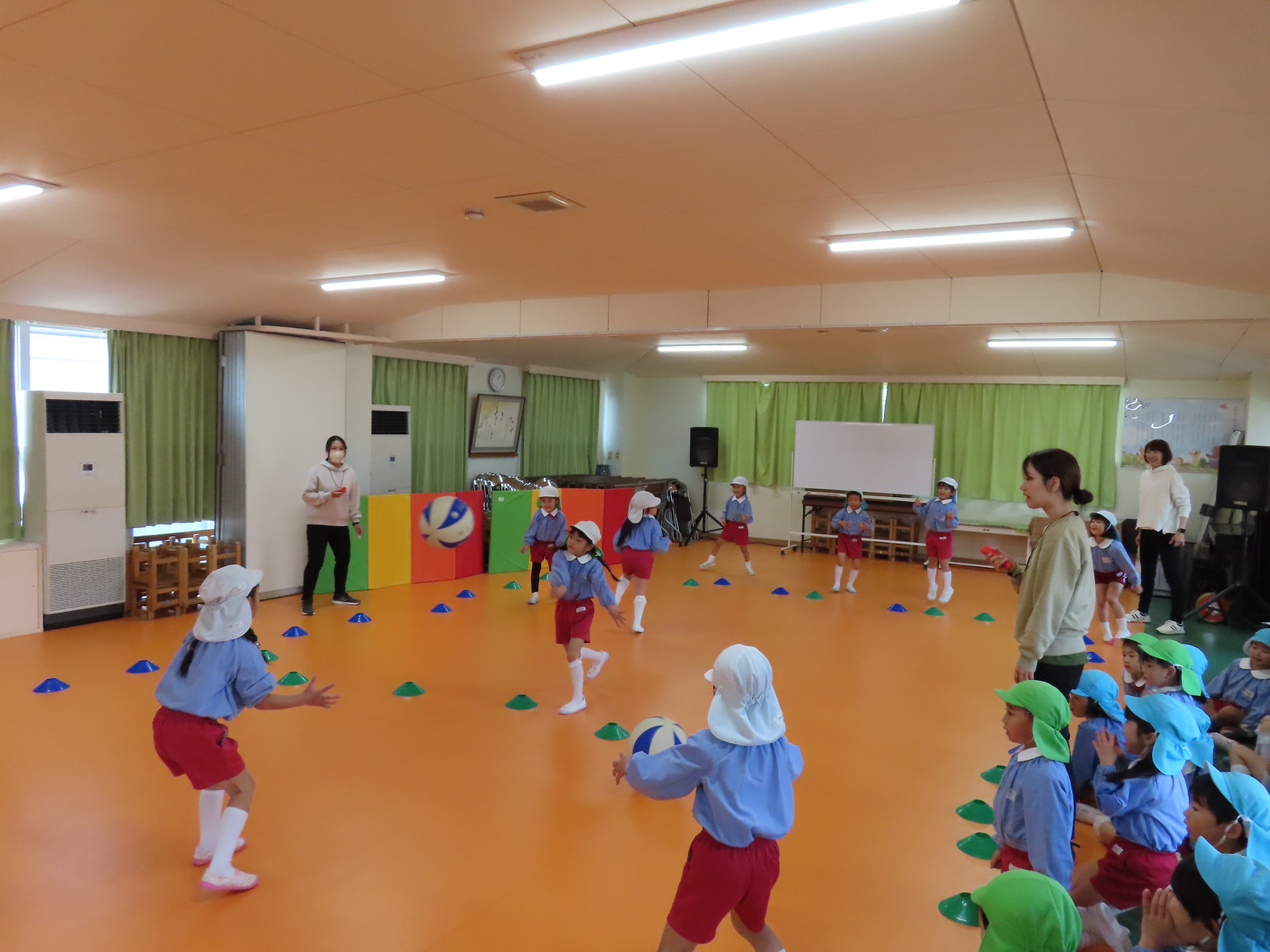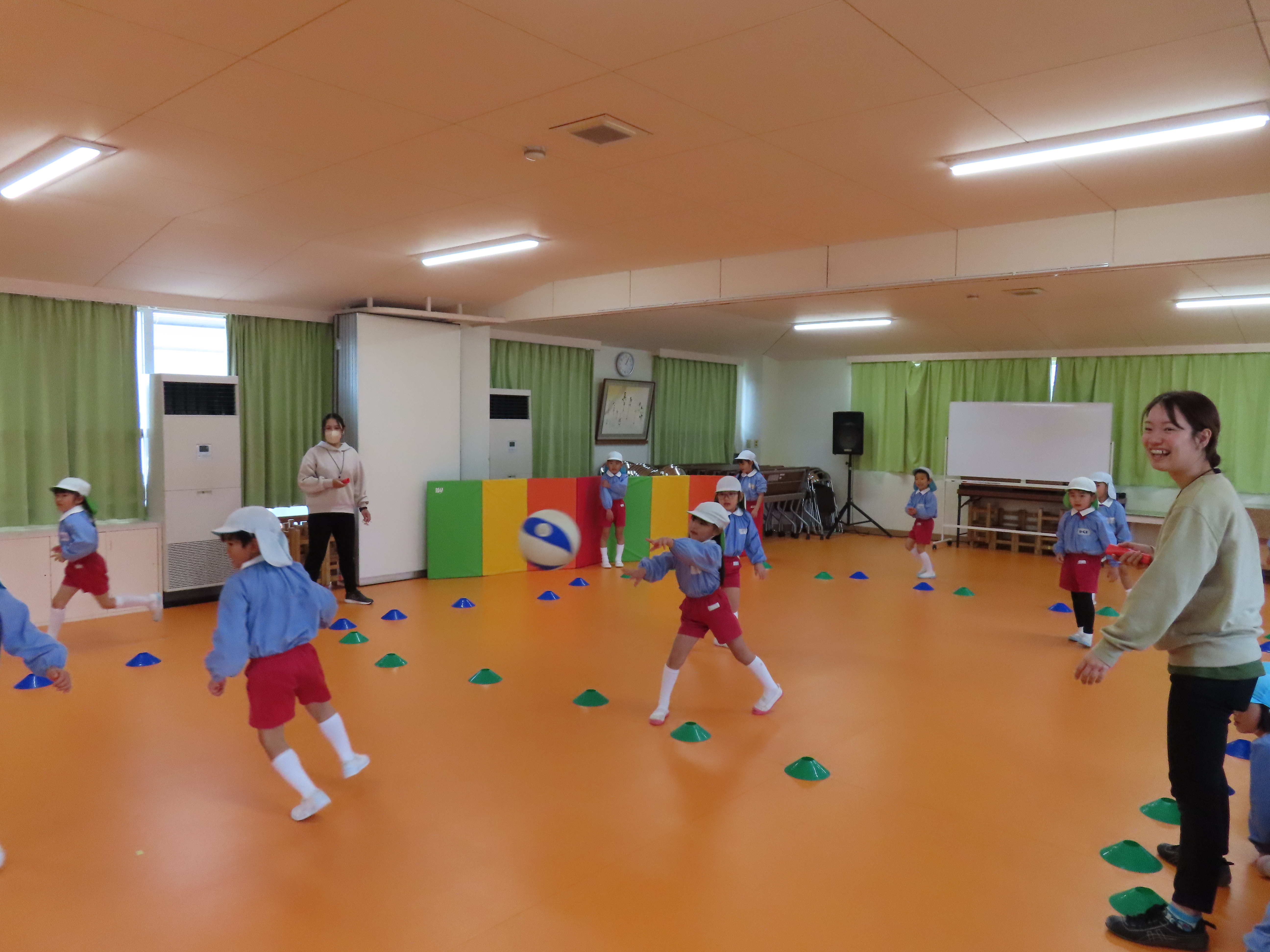 年長さんになると、午後に何をしたいか先生にリクエストして来ます。今日は、ドッジボールをしたいと言う園児の希望で、ボールを2個同時に使うドッジボールが始まりました。前から飛んできたり、後ろから飛んできたりで、右往左往しながらボールをよけたり、はさみうちしたり、ボールを持ったどうしが決闘のようになったりして大盛り上がりでした。
