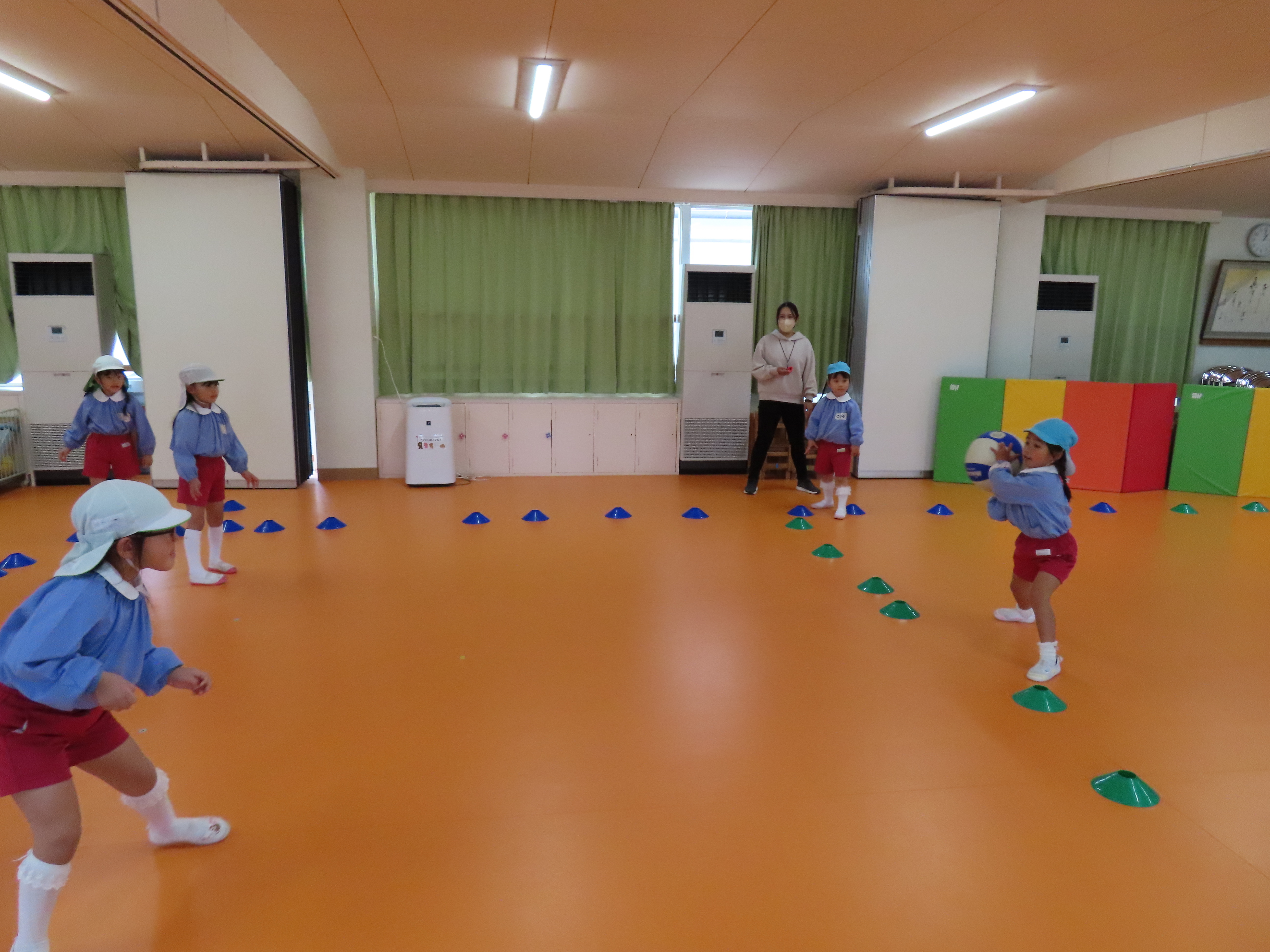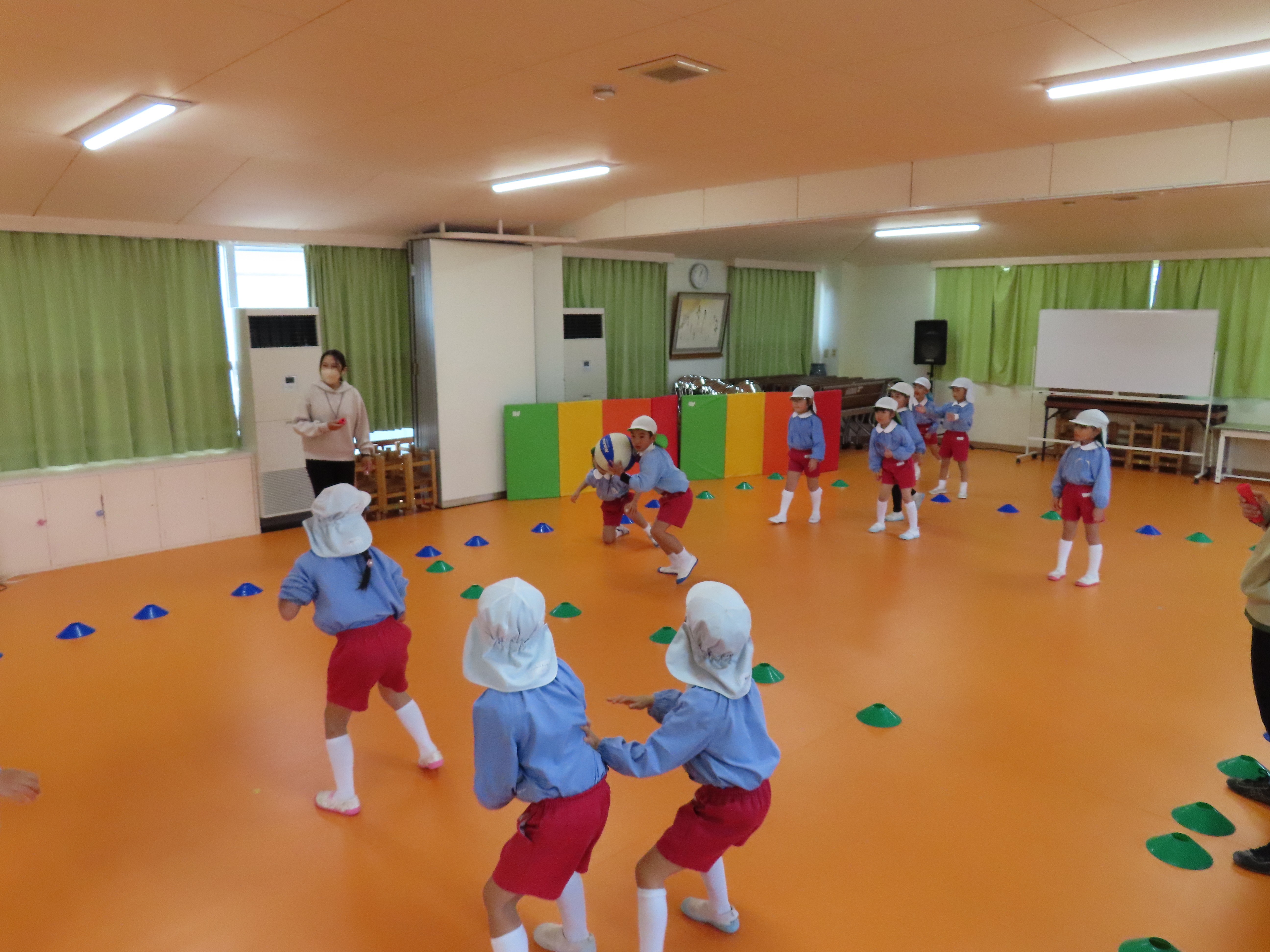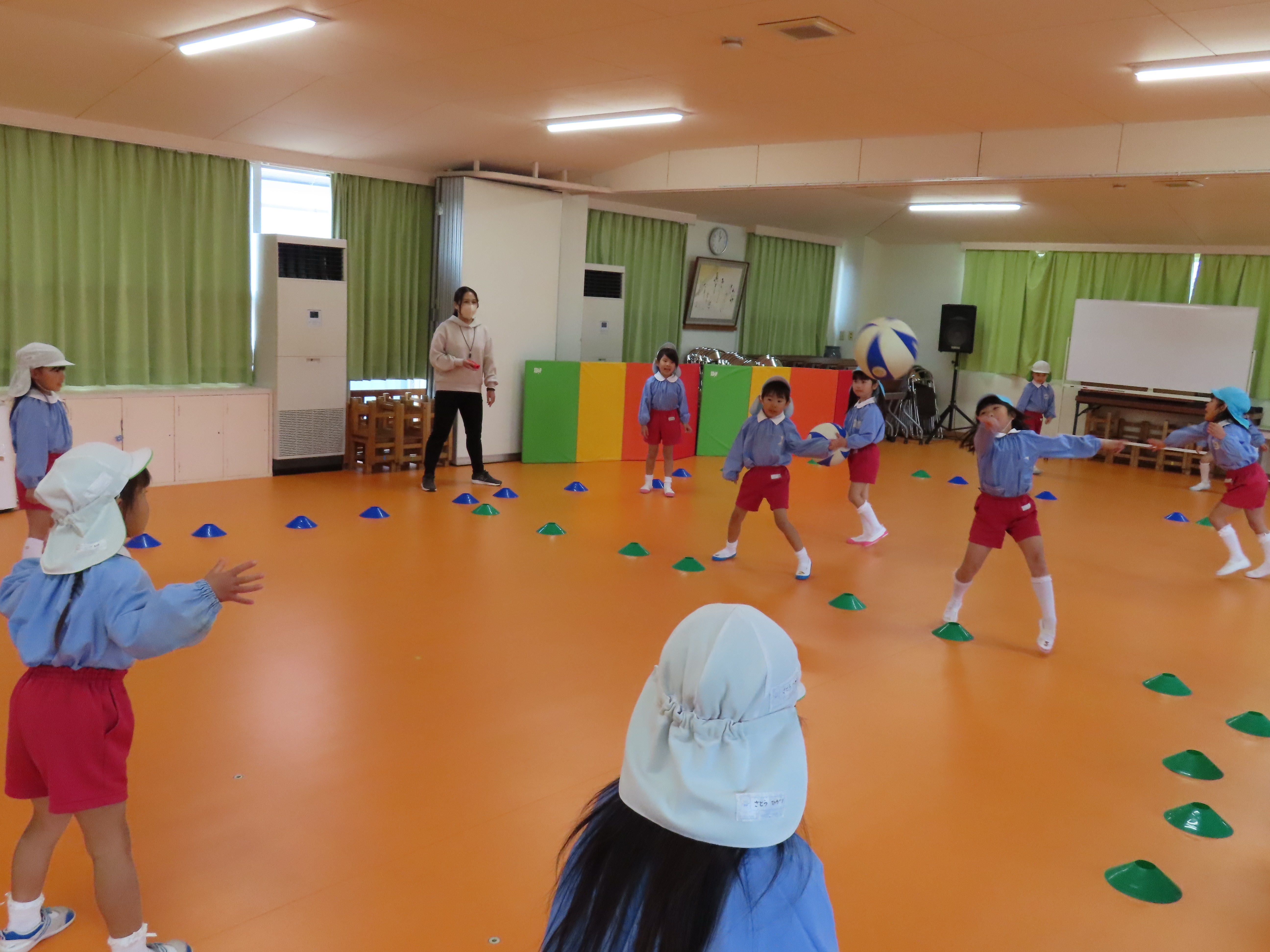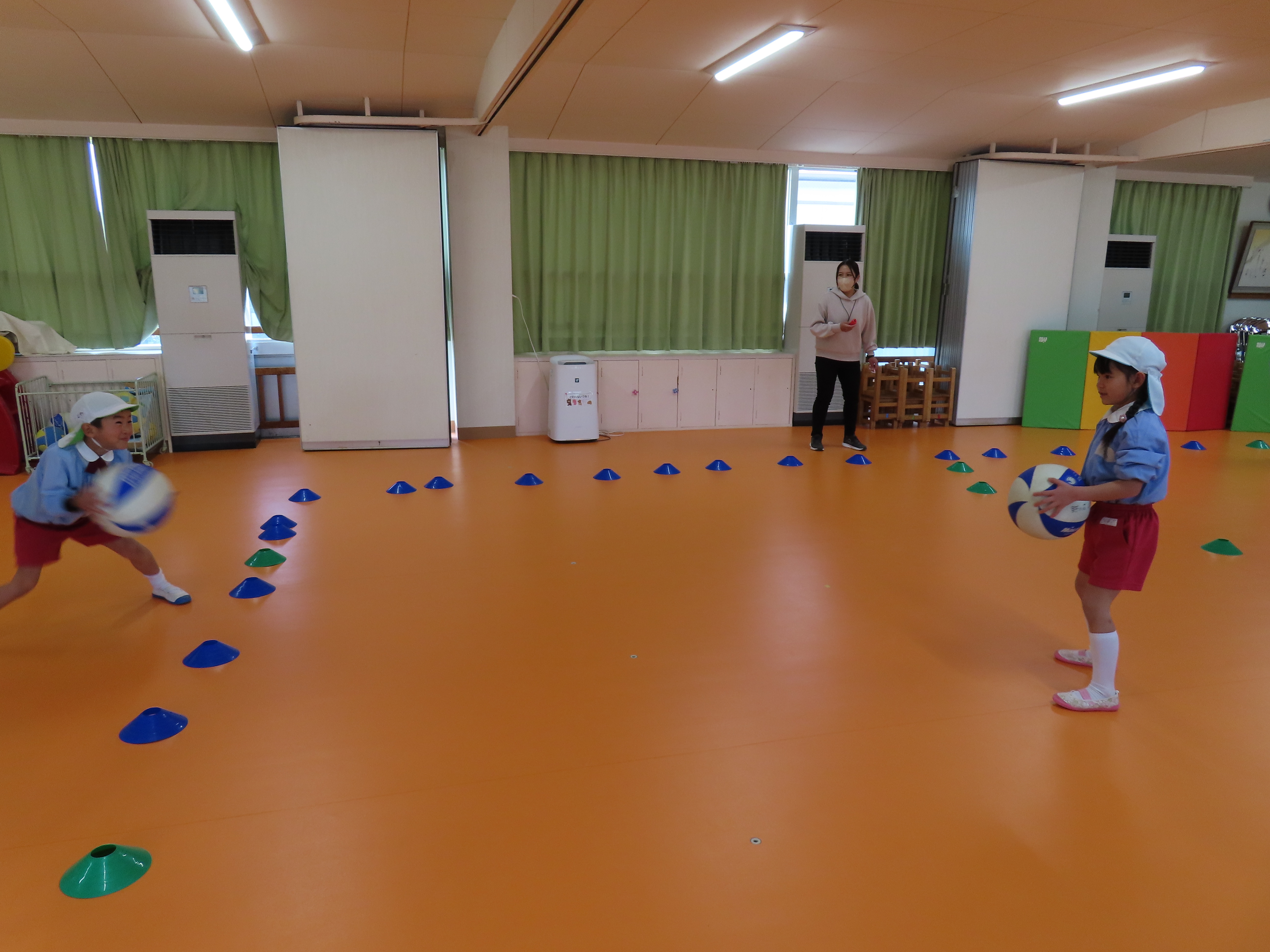 年長さんになると、午後に何をしたいか先生にリクエストして来ます。今日は、ドッジボールをしたいと言う園児の希望で、ボールを2個同時に使うドッジボールが始まりました。前から飛んできたり、後ろから飛んできたりで、右往左往しながらボールをよけたり、はさみうちしたり、ボールを持ったどうしが決闘のようになったりして大盛り上がりでした。